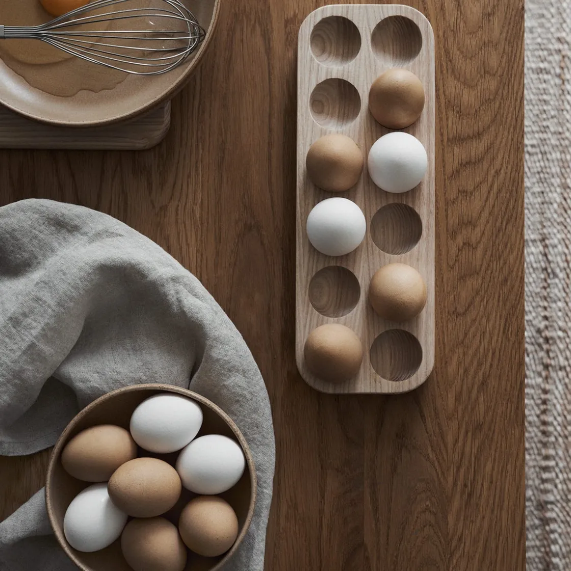Ett äggställ i ask som passar snyggt på köksbänken för förvaring av ett dussin ägg. Du kan förvara äggen i denna hållare både i skafferiet och på bänken så att äggen står redo för användning. Vid inoljning av en neutral olja kan träet få en något varmare gul nyans. Tål ej diskmaskin.