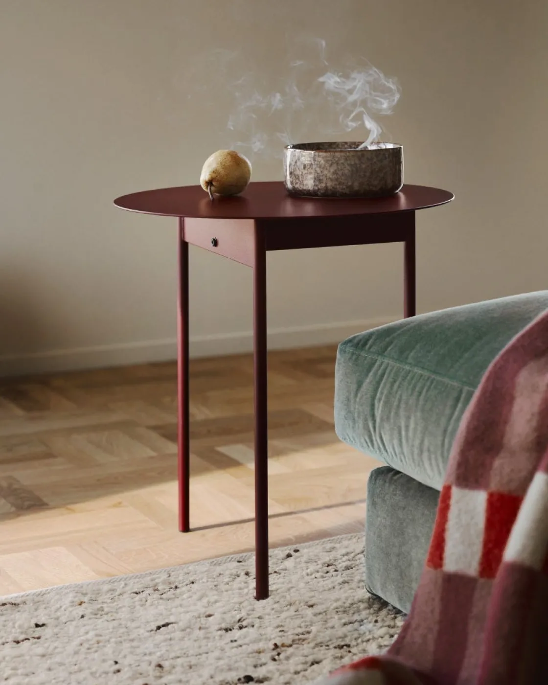 Vinrött sidobord i pulverlackerad metall med matt finish. Bordets smidiga storlek gör det lättplacerat i både små och stora utrymmen – använd det som sideboard bredvid soffan, som sängbord eller som avlastningsbord i hallen. Bordet är tillverkat i 100% metall och pulverlackerat för att skydda mot rost vilket gör det slitstarkt och lätt att underhålla. Dess stilrena design och den vinröda färgen ger en livfull och modern känsla till ditt hem.