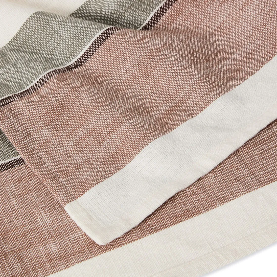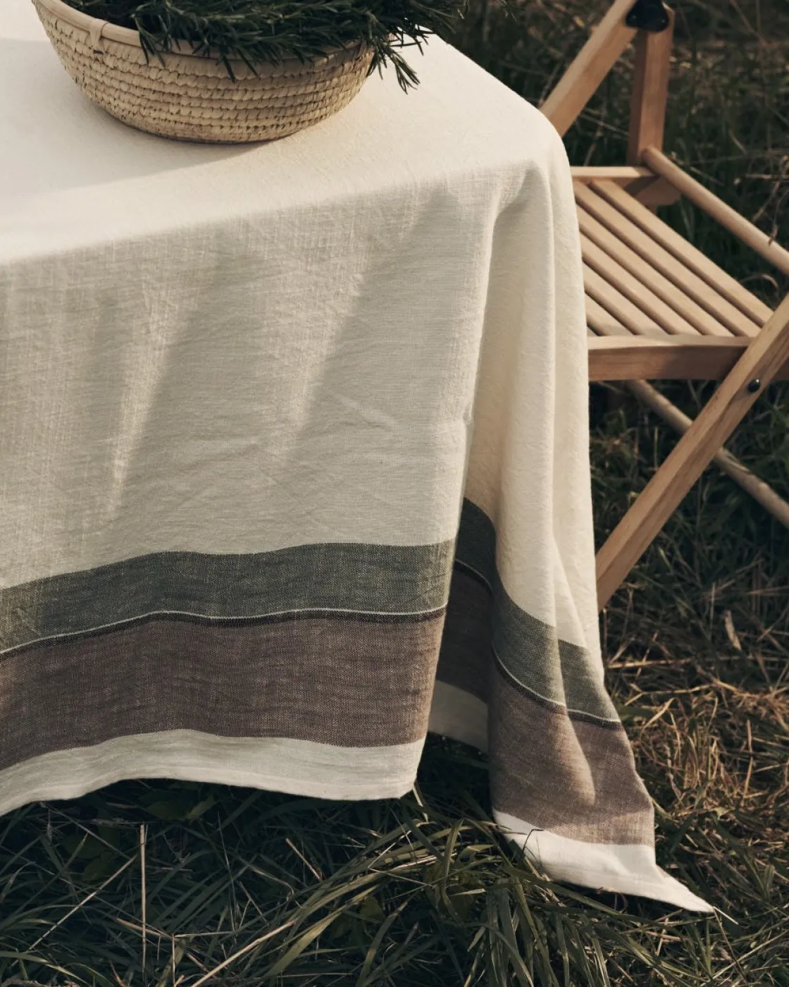 Oeko-tex certifierad bordsduk av 100% bomull. En offwhite duk med en bred rand i jordnära toner längs med både kort- och långsidorna. Tillför en mjuk och ombonad känsla till bordet och funkar lika fint till vardags som till fest. Kombinera den gärna ihop med de matchande tygservetterna i samma serie.
