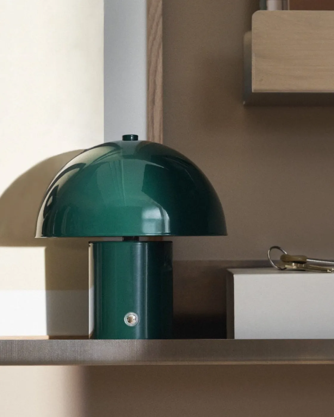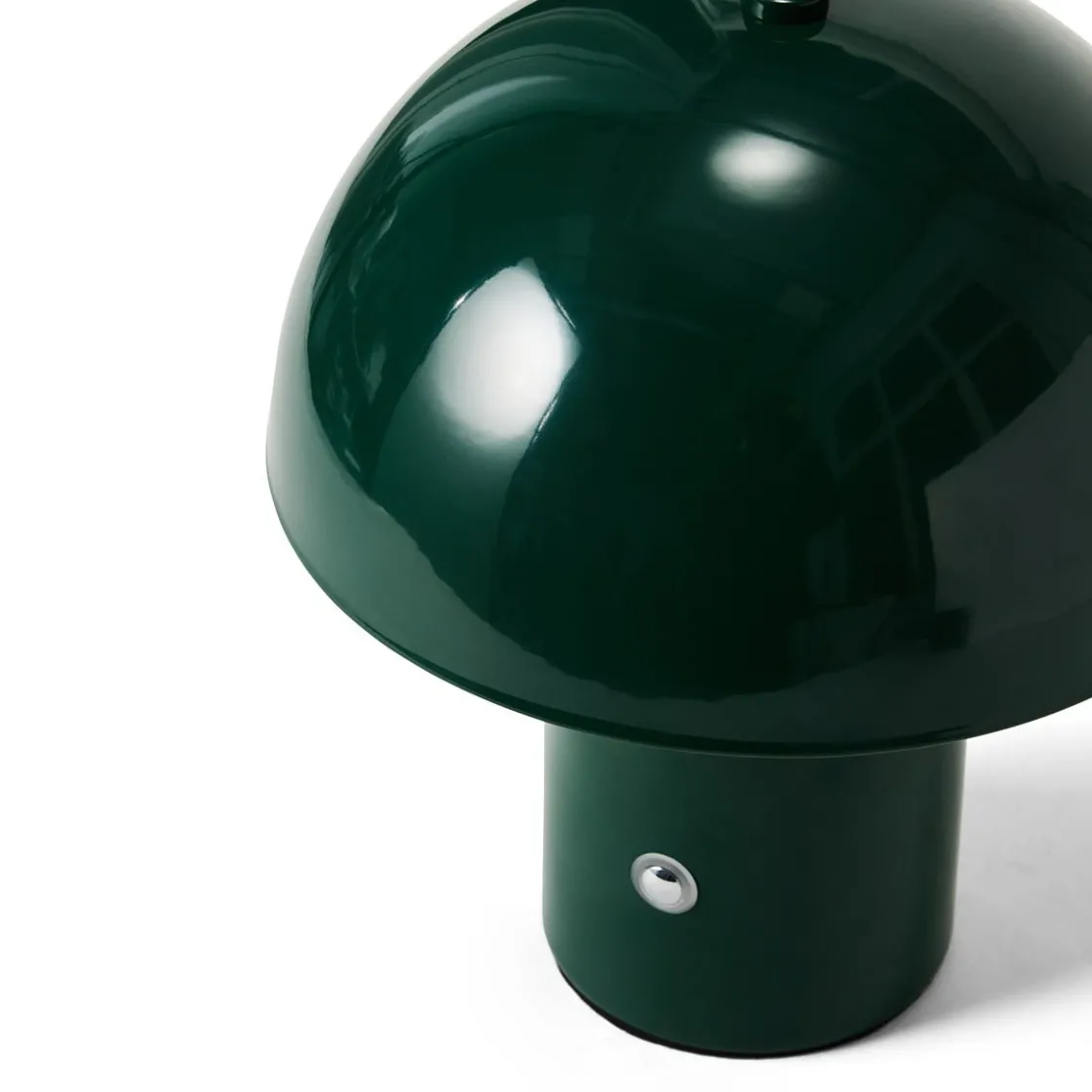 Mörkgrön, svampformad bordslampa i blank metall som adderar det där lilla extra till din inredning. Dess kompakta storlek gör den lättplacerad och mångsidig och det inbyggda batteriet gör det enkelt att flytta runt lampan utan att vara beroende av eluttag. Lampan är dimbar och har justerbar färgtemperatur vilket gör att den kan ge både varm mysbelysning och klarare arbetsljus. Touch-knapp för smidig tändning, släckning och ljusjustering. USB-kabel för laddning ingår.
