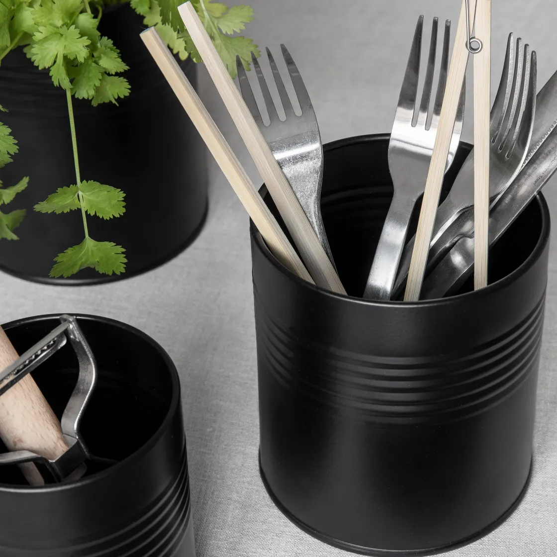 Konservburk i galvaniserat stål med svart pulverlack. Lika schysst till bestick, som till pennor eller som liten örtkruka.