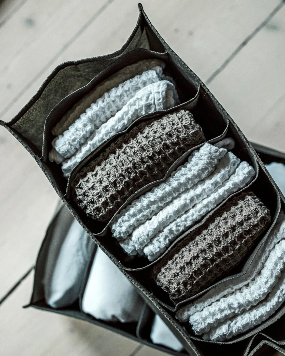 Smart hopvikbar förvaringslåda med 8 olika fack gjord av 100% återvunna PET-flaskor. I facken kan du till exempel förvara handdukar eller andra saker som behöver hållas separerade, funkar att ha i trådbackar, hyllor eller garderober. Finns också i en större storlek.