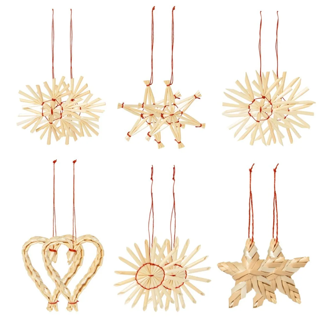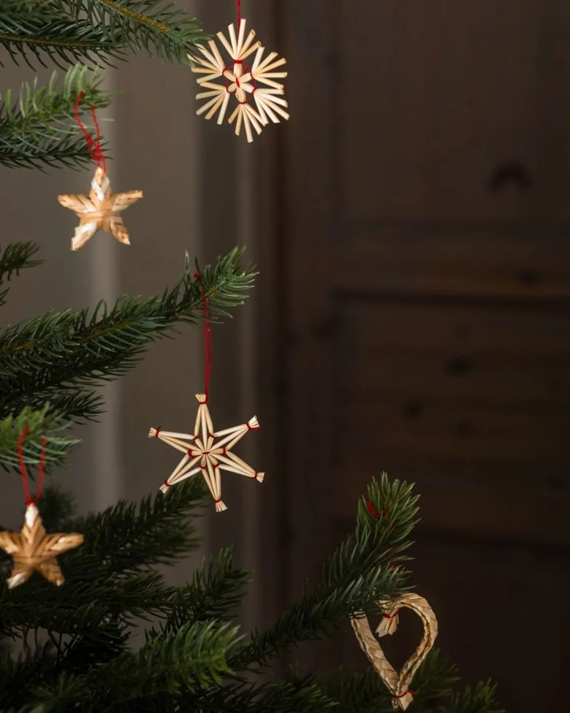 Klassiska juldekorationer i halm med röda snören. Ett tidlöst val av julgranspynt som alltid känns lika aktuellt och passar till såväl traditionella som moderna hem. Mått: ca 4cm.