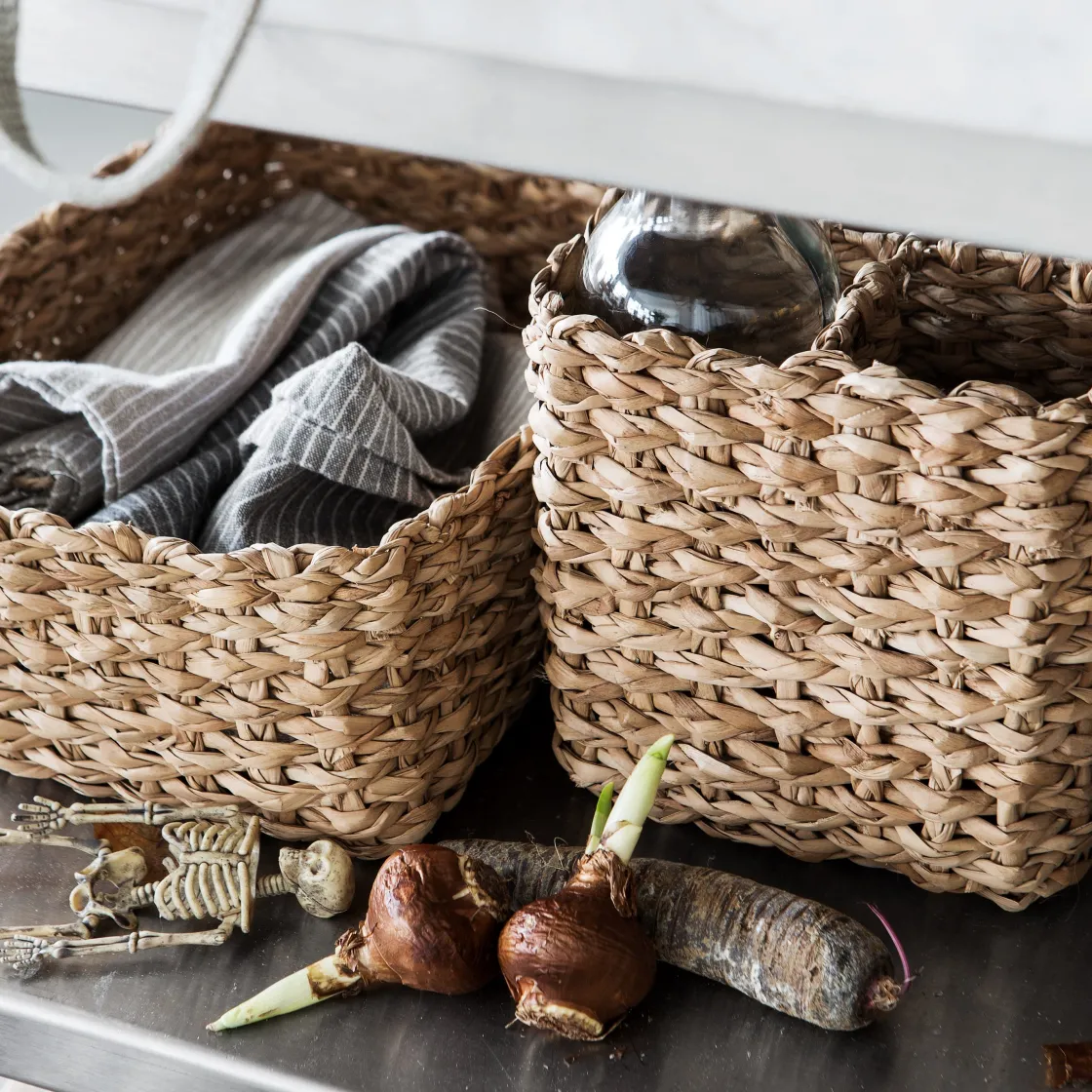 Fyrkantig korg av flätad abaca. Abaca är ett träd som påminner om bananträdet i utseende. Det blir ca: 6 m högt och tar 18-24 månader att växa på sig från frö till fällklart träd. Allt arbete med korgarna görs för hand. Tillverkning sker i Filippinerna.