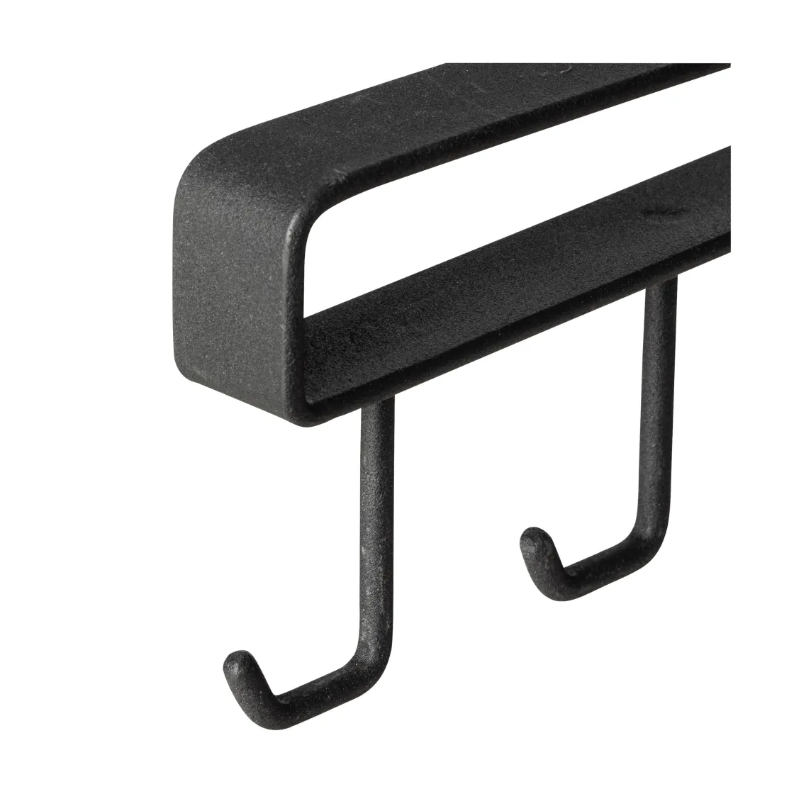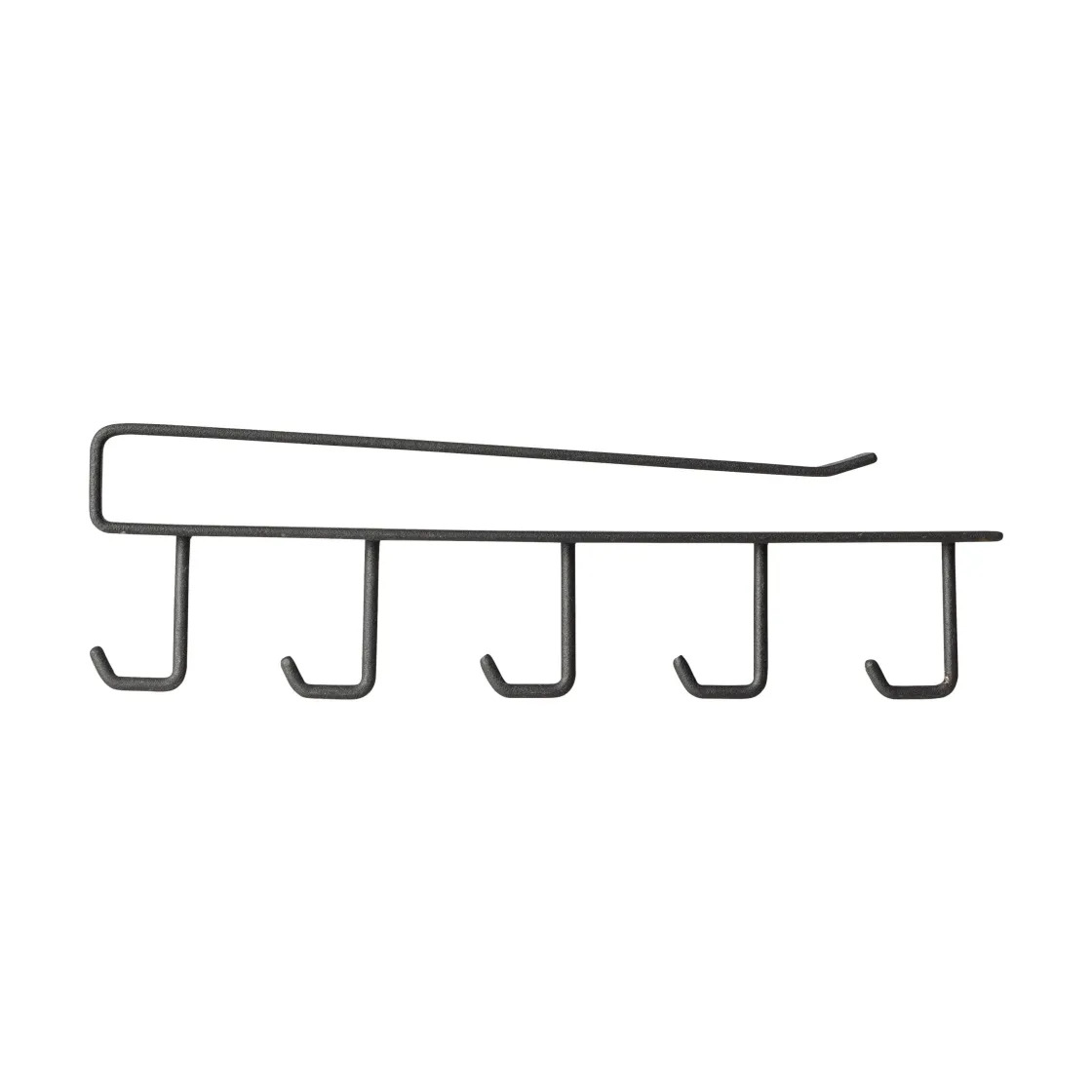 Svart list i pulverlackad metall för hylla med 5st krokar för att kunna hänga upp exempelvis köksredskap eller kläder.