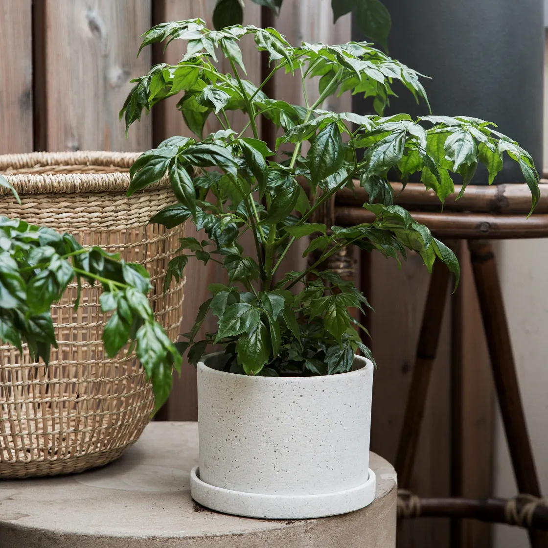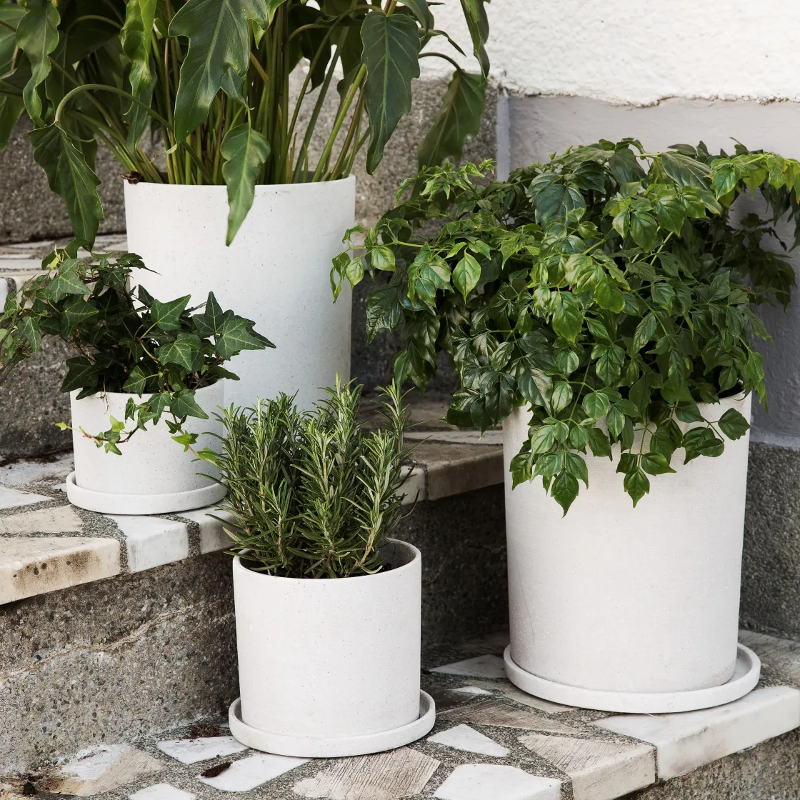 Låt allt grönt bli skönt i frosttåliga cylinderformade krukor med fat av polystone. Mixa och blanda olika storlekar och placera i grupp!