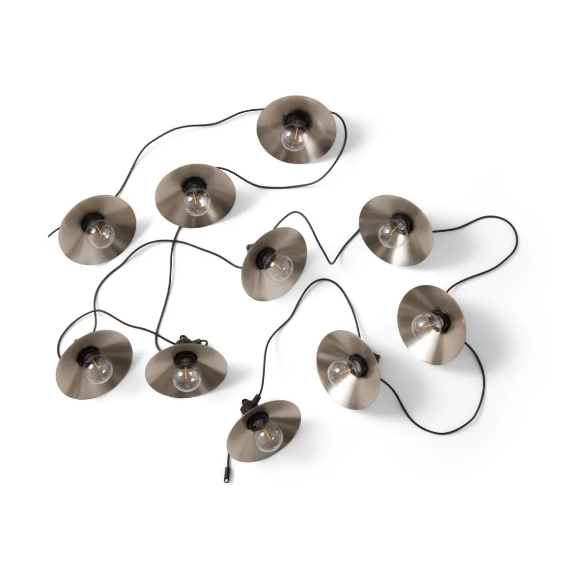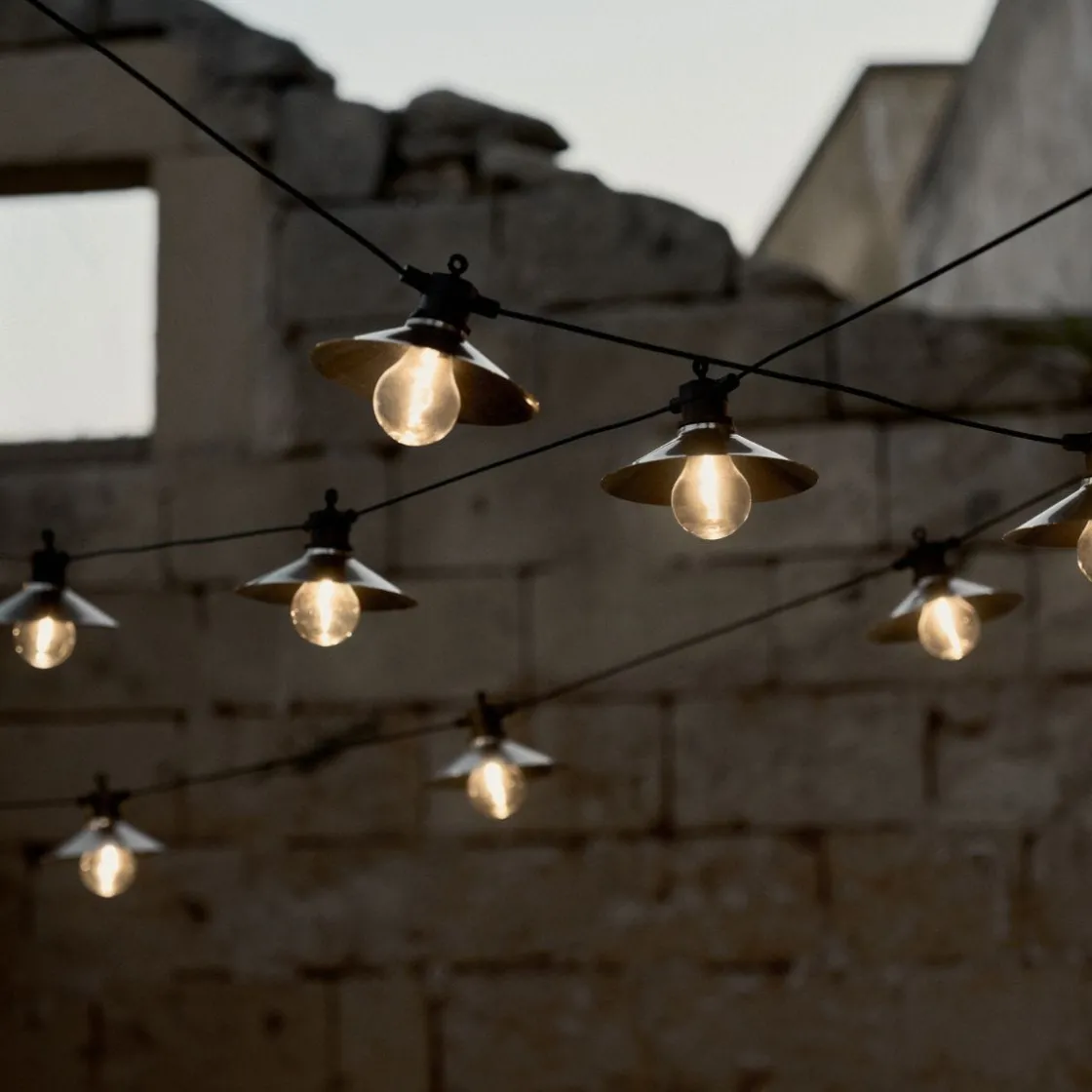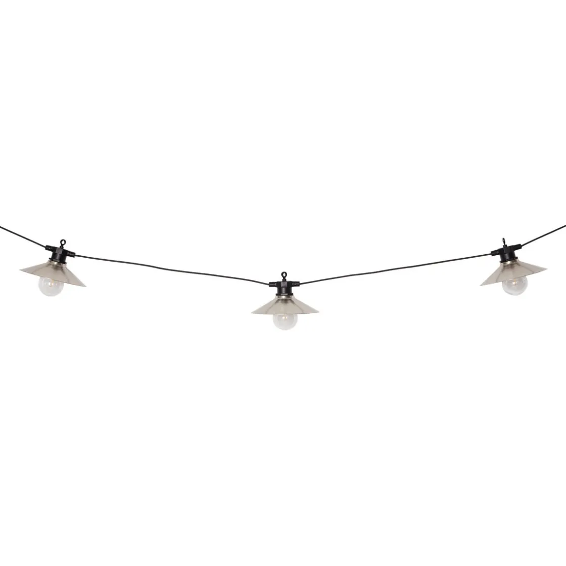 Skapa en stämningsfull utomhusmiljö med denna fina ljusslinga med metallskärmar. Slingan är designad för både inomhus- och utomhusbruk och ger ett varmvitt sken som lyser upp kvällarna. Slingan är totalt 7,5m lång varav 4,5m med klara glödlampor (E27-sockel). Observera att ljusslingan inte har dimmer- eller strömbrytarfunktion. Energiklass G.