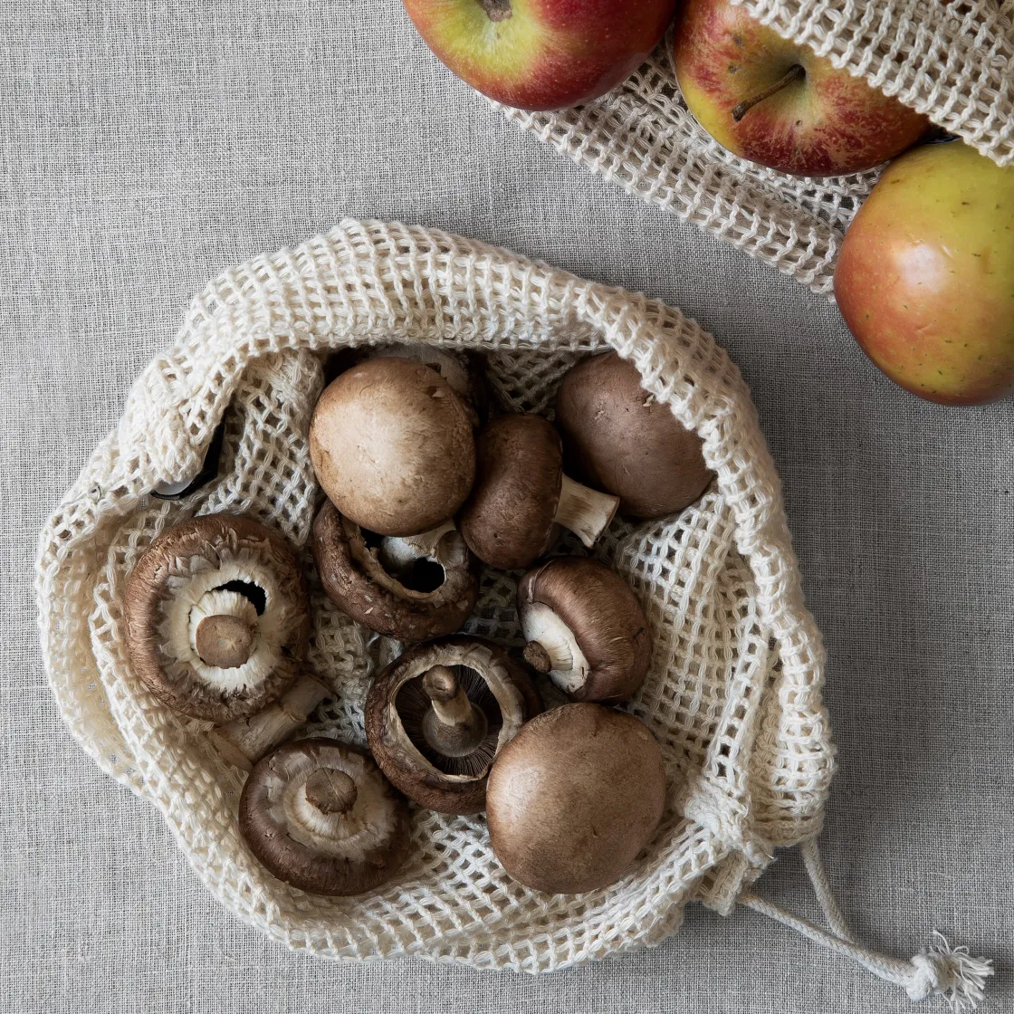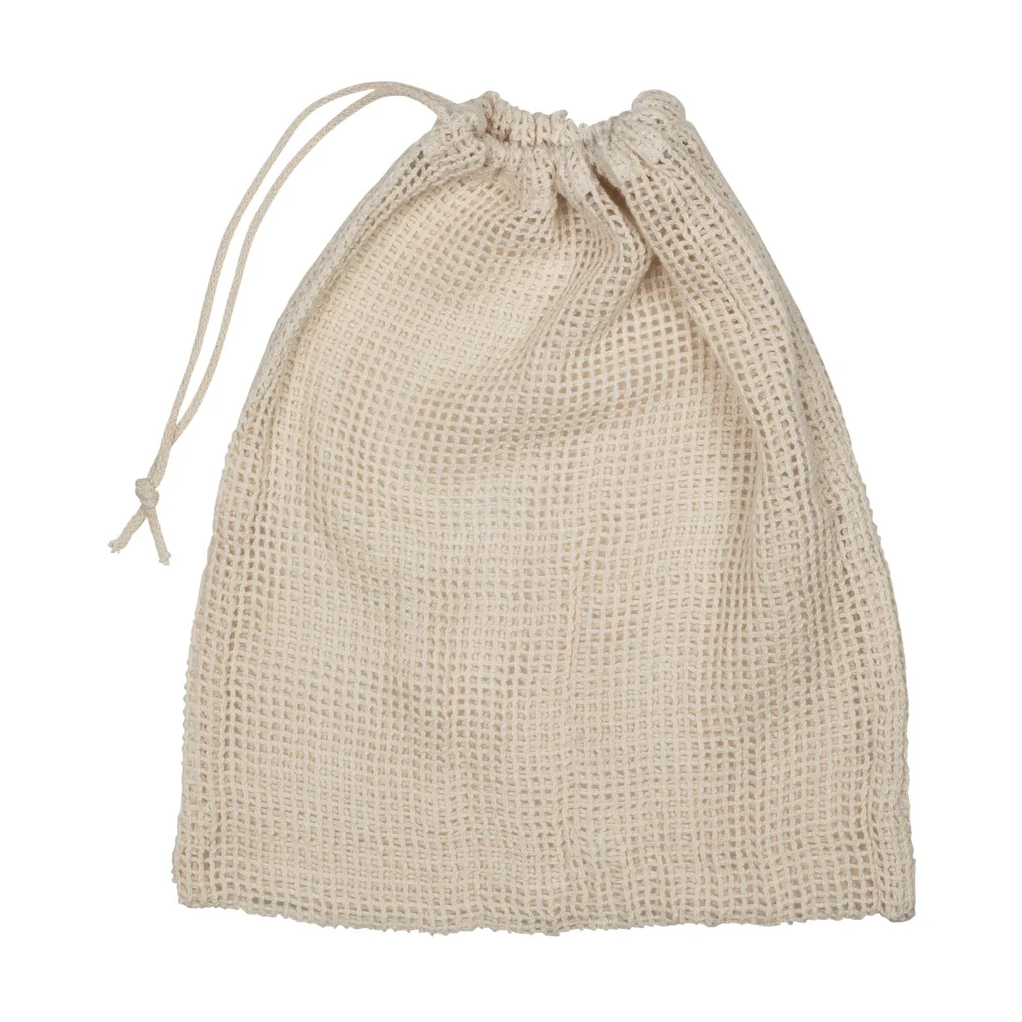 Nätpåse med dragsko tillverkad i 100% ekologiskt odlad bomull.
