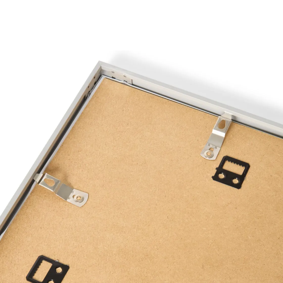Dekorativ ram i aluminium och riktigt glas. Ramen kan hängas upp både vertikalt och horisontellt. Baksidan fästs med smidiga clips som gör det enkelt att byta ut konstverket i ramen. Kanten på ramen är 9mm bred. Baksida av MDF.