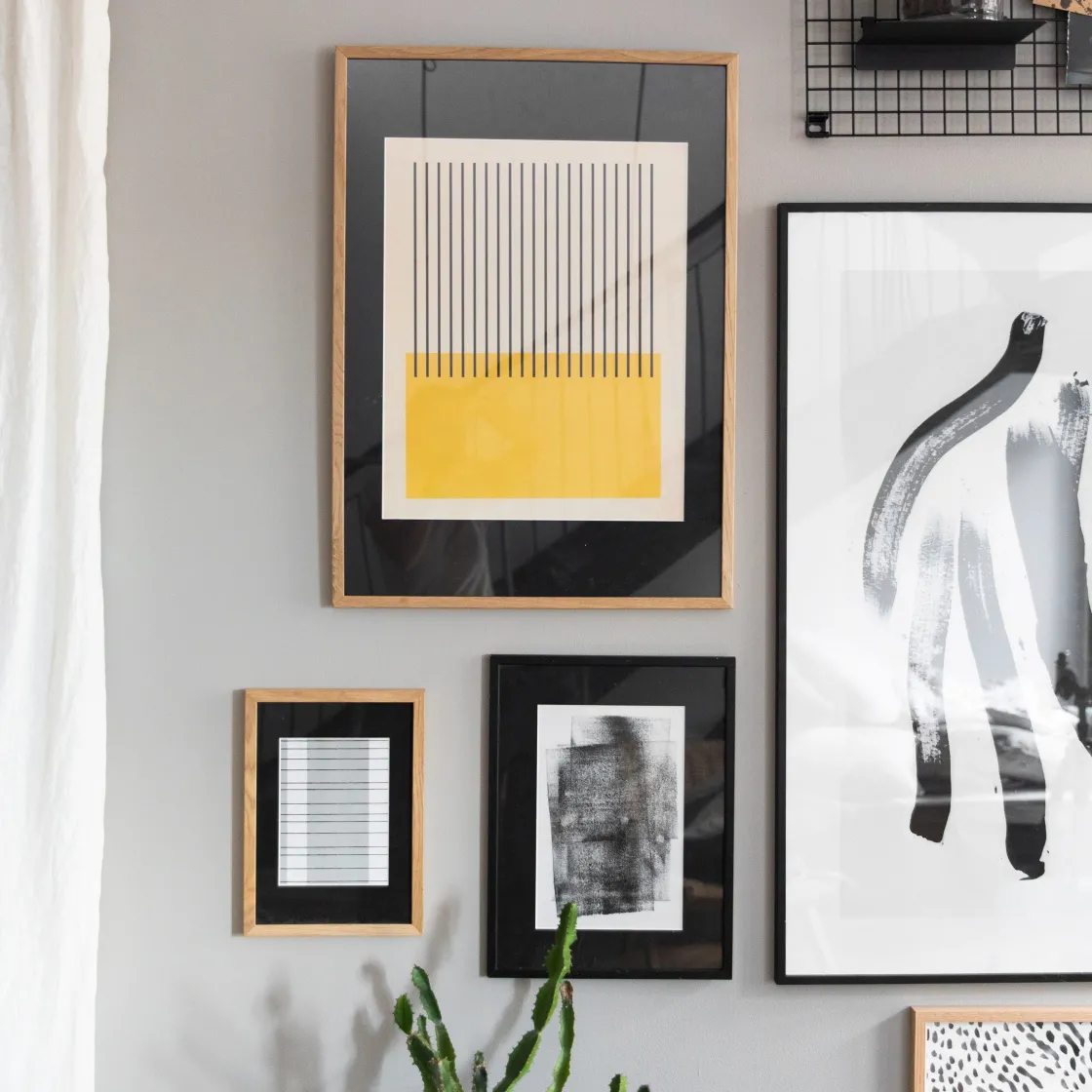 Ramen har en metallhängare fastsatt baktill, så du enkelt kan sätta upp ramen på väggen. Skruv tillkommer inte. Olika väggmaterial kräver olika typer av fästbeslag, använd beslag som passar väggarna i ditt hem, säljes separat. Passepartout säljs även den separat.