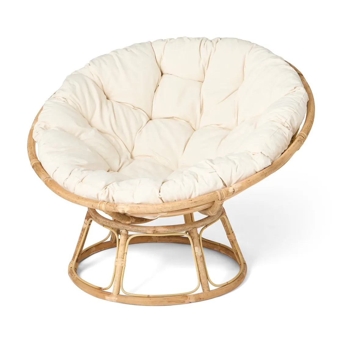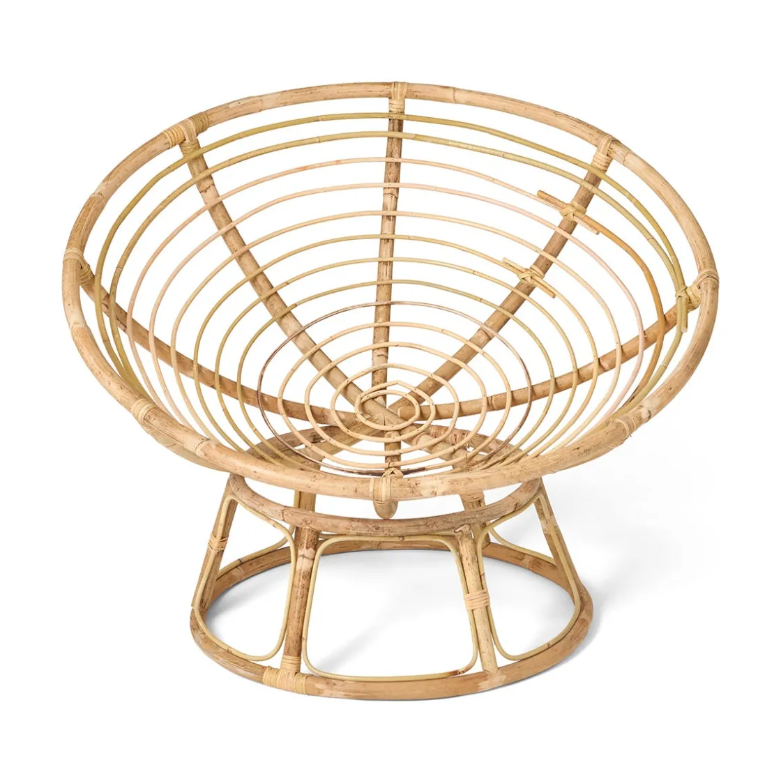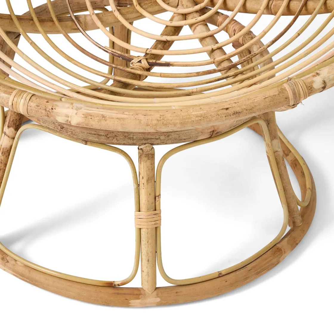 Fåtöljens ram är tillverkad av rotting och är tvådelad – en nedre konformad del och en skålformad del som placeras centrerat ovanpå sitsen. Kom ihåg att köpa till dyna rund stor för att få en komplett fåtölj att sjunka ner i.