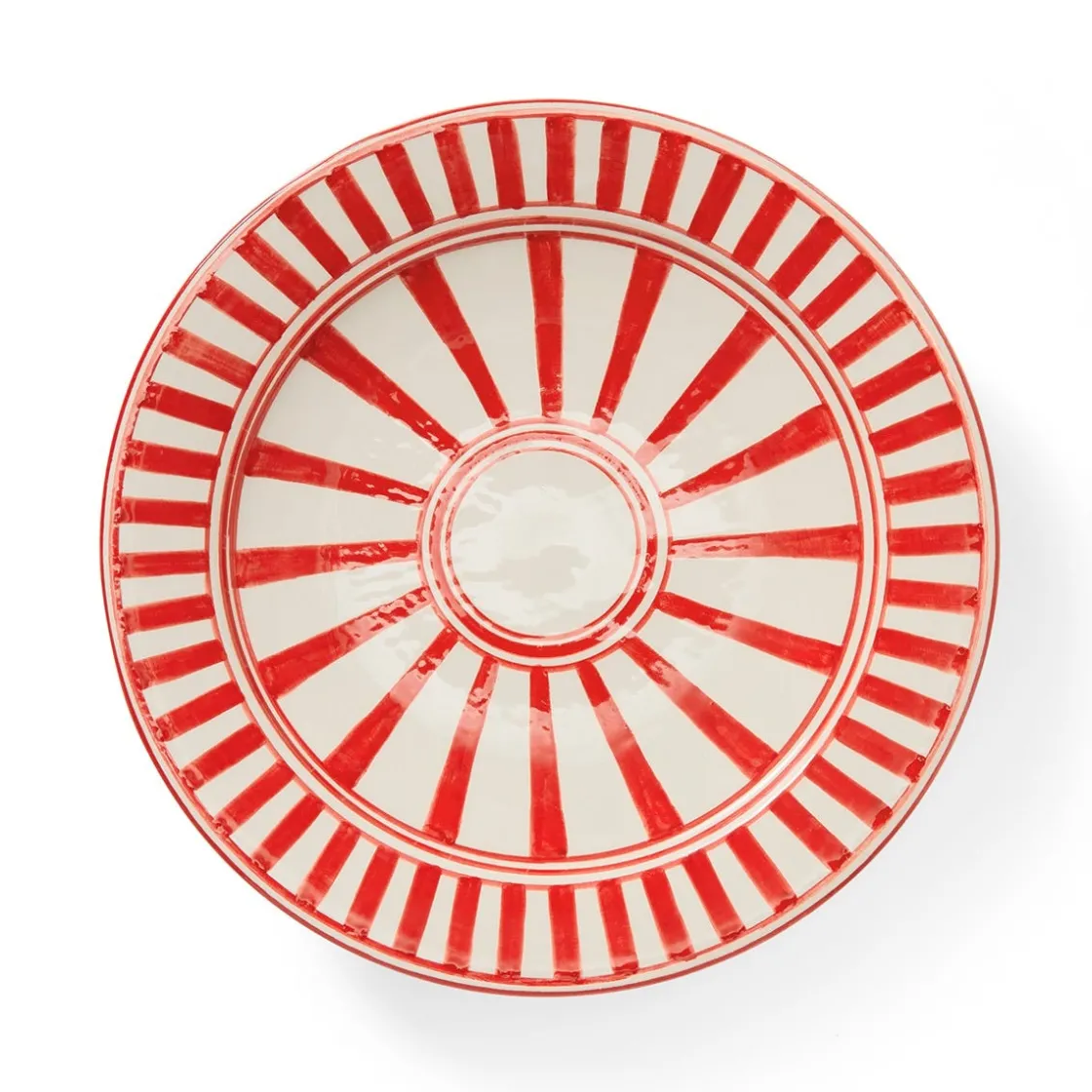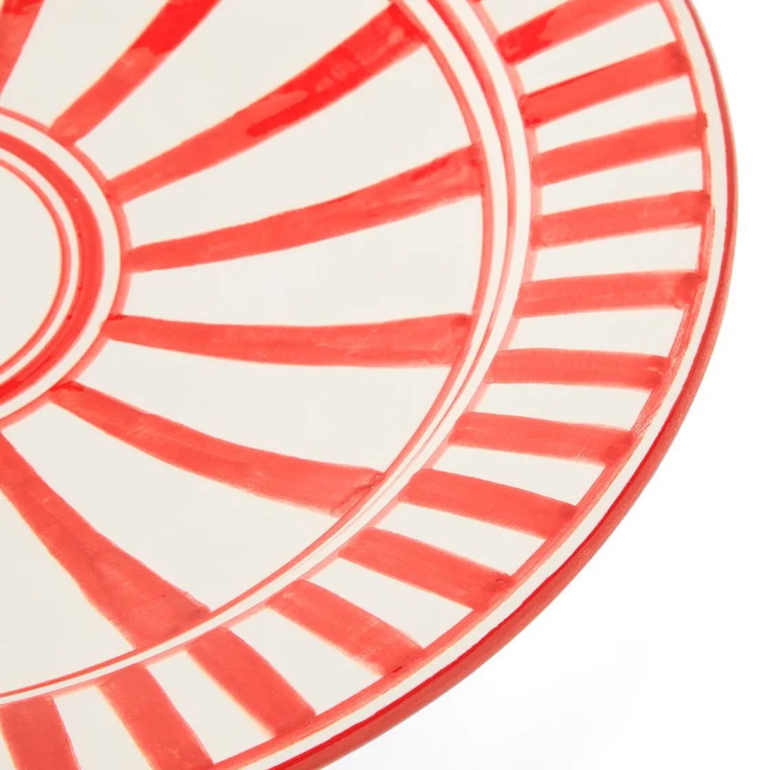Handmålat serveringsfat i vit lera med blyfria färger och ett dekorativt mönster i rött och vitt som är extra fint till juldukningen. Fatets tidlösa design passar i de flesta miljöer och till såväl vardag som fest. Diskas för hand.