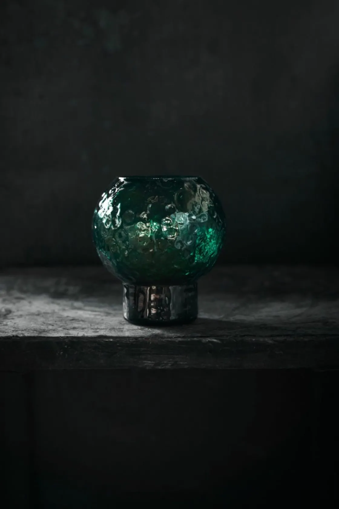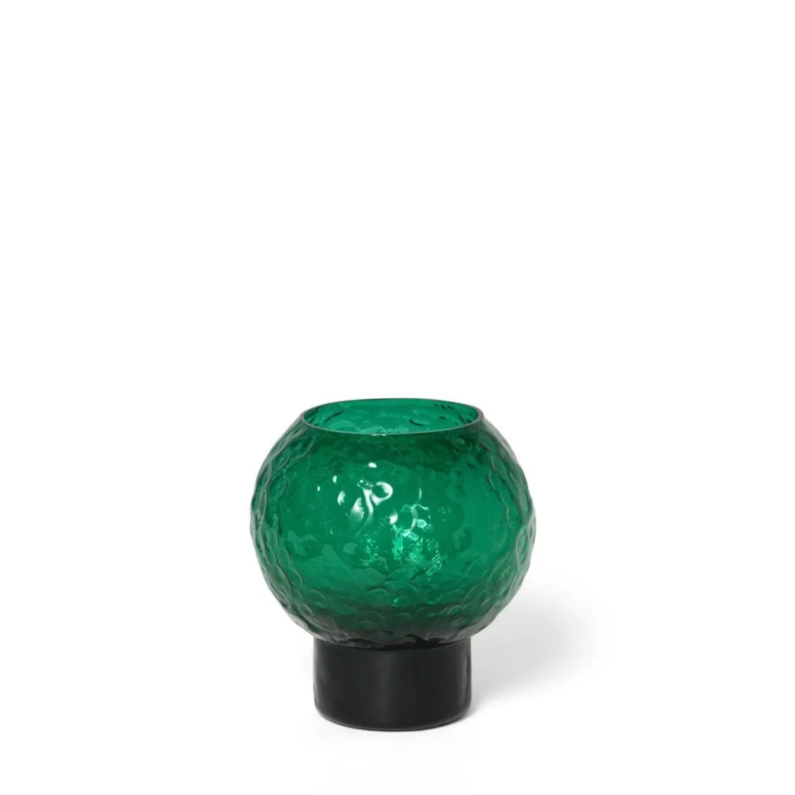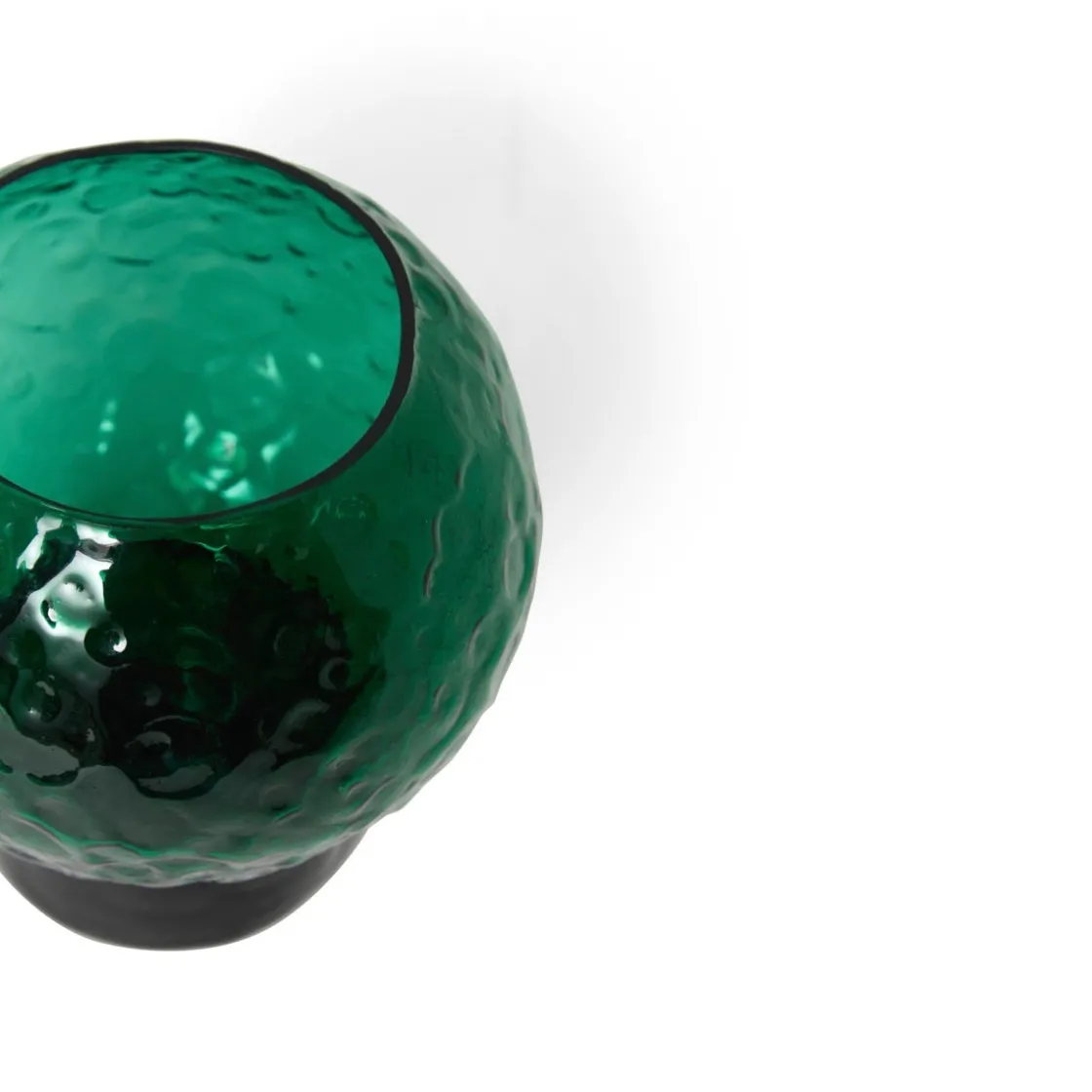 Munblåst grön ljuslykta, framtagen i samarbete med Skrufs Glasbruk i Småland. Varje objekt är munblåst med precision och fingertoppskänsla av Skrufs skickliga glasblåsare. Ljuslyktans struktur ger glaset liv och karaktär och skapar ett unikt ljusspel som framhäver hantverket bakom varje exemplar. Finns även i klarglas och orange.