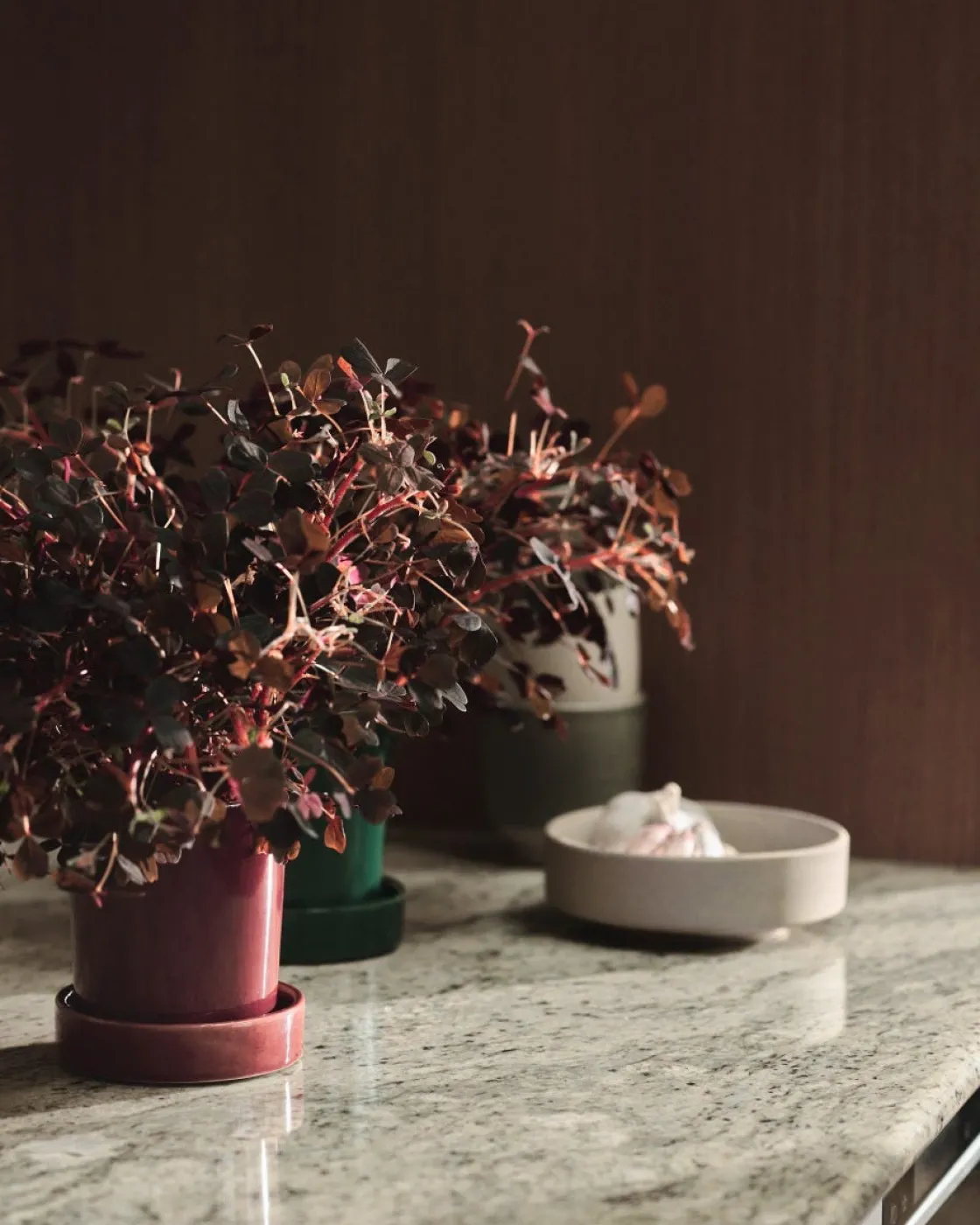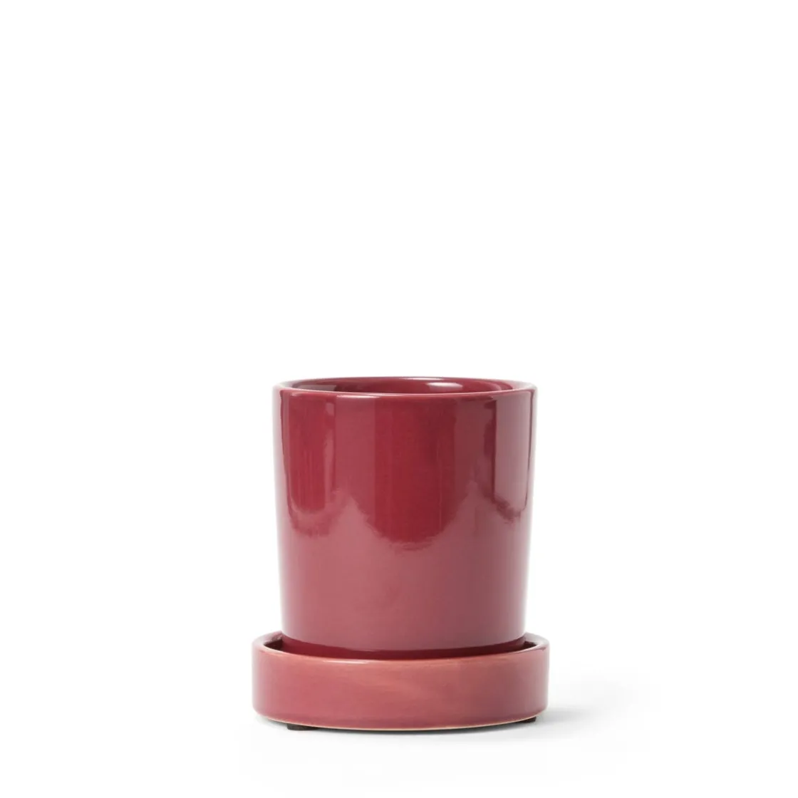 Mindre mörkröd kruka i stengods med tillhörande fat, perfekt för exempelvis färska kryddor på köksbänken. Krukan har ett dräneringshål och kan användas både ute och inne. Fin att ha flera ihop eller på egen hand. Matcha den gärna med blomkrukan i samma färg eller krukorna i samma serie i andra färger.