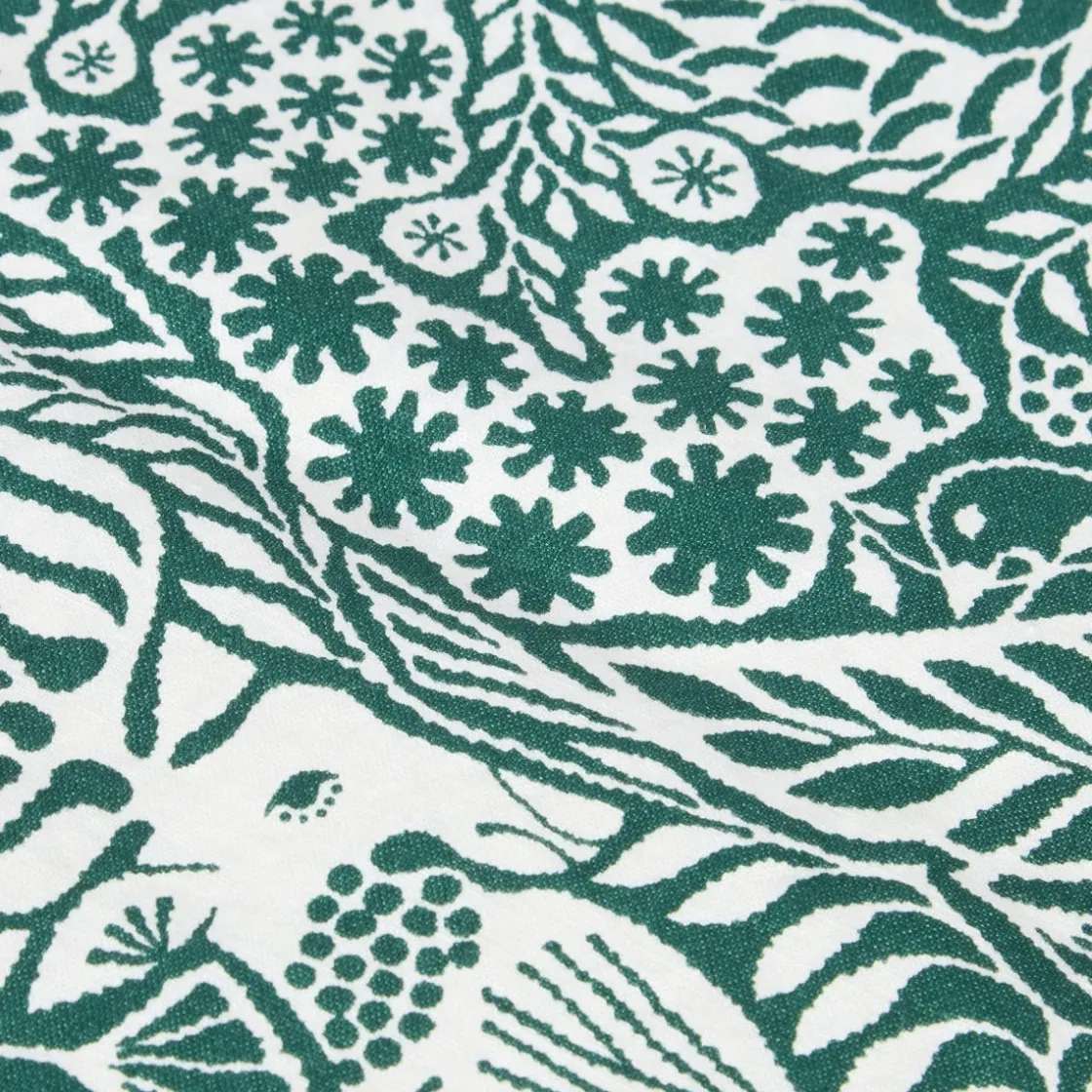 Höj känslan kring bordet med denna bordsduk med ett detaljrikt mönster i grönt och vitt ritat av den japanske illustratören Toshiyuki Fukuda, med inspiration från de nordiska skogarna. Duken är tillverkad i en mix av bomull och linne, är Oeko-tex certifierad och kan tvättas i maskin.
