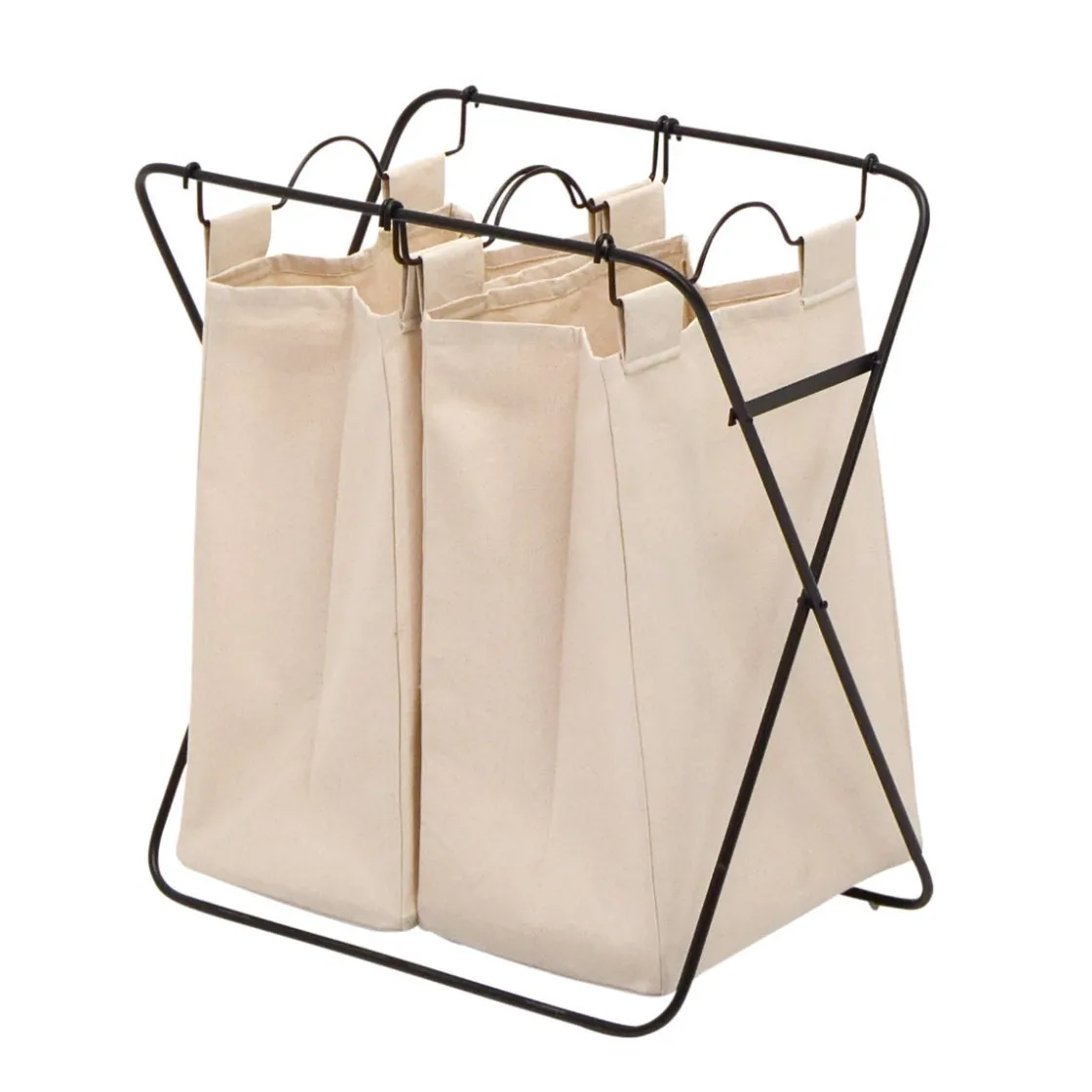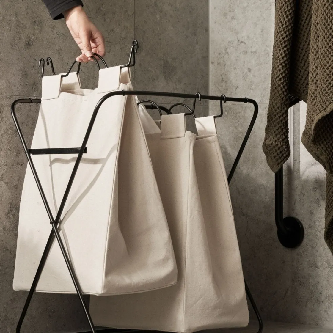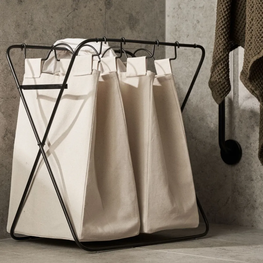 Stilren och praktisk tvättkorg av metall med två separata tvättpåsar av 100% återvunnen bomullscanvas. Sortera smutstvätten efter färg i de olika korgarna som sedan enkelt lyfts av ställningen och kan bäras till tvättmaskinen när det väl är dags att tvätta. Del av serien Noa med matchande inredningsdetaljer till badrummet.
