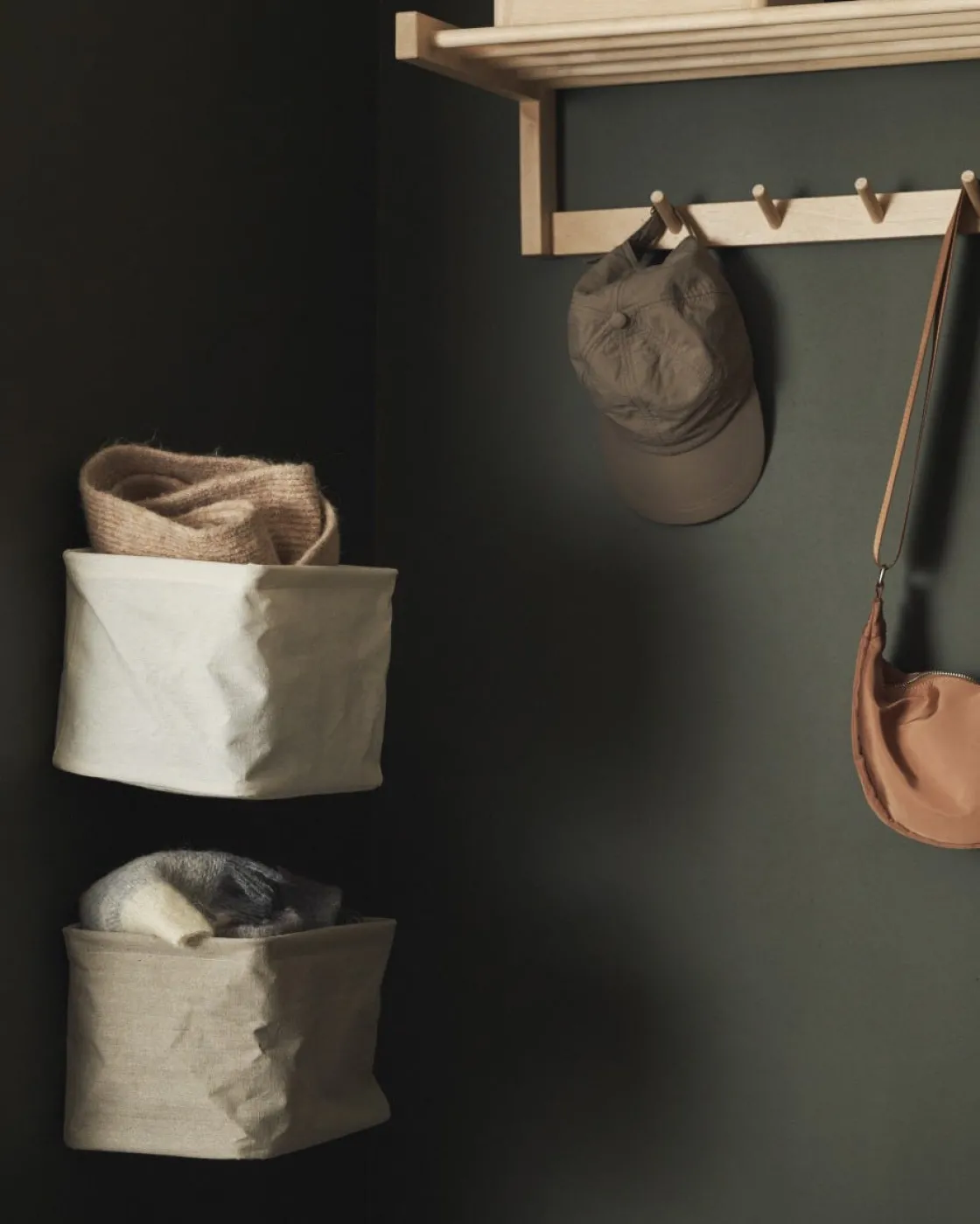 En praktisk och stilren hopvikbar väggkorg av beige textil med subtila hål för smidig väggmontering. Korgen är både snygg och funktionell och erbjuder en smart förvaringslösning för mindre utrymmen, till exempel i hallen. Perfekt för förvaring av accessoarer och vardagens småsaker. Den textilklädda ytan ger en varm känsla och korgens PE-coating på insidan som gör den enkel att torka av. Observera att korgen är avsedd för inomhusbruk och bör inte tvättas, blekas, torktumlas, strykas eller kemtvättas.