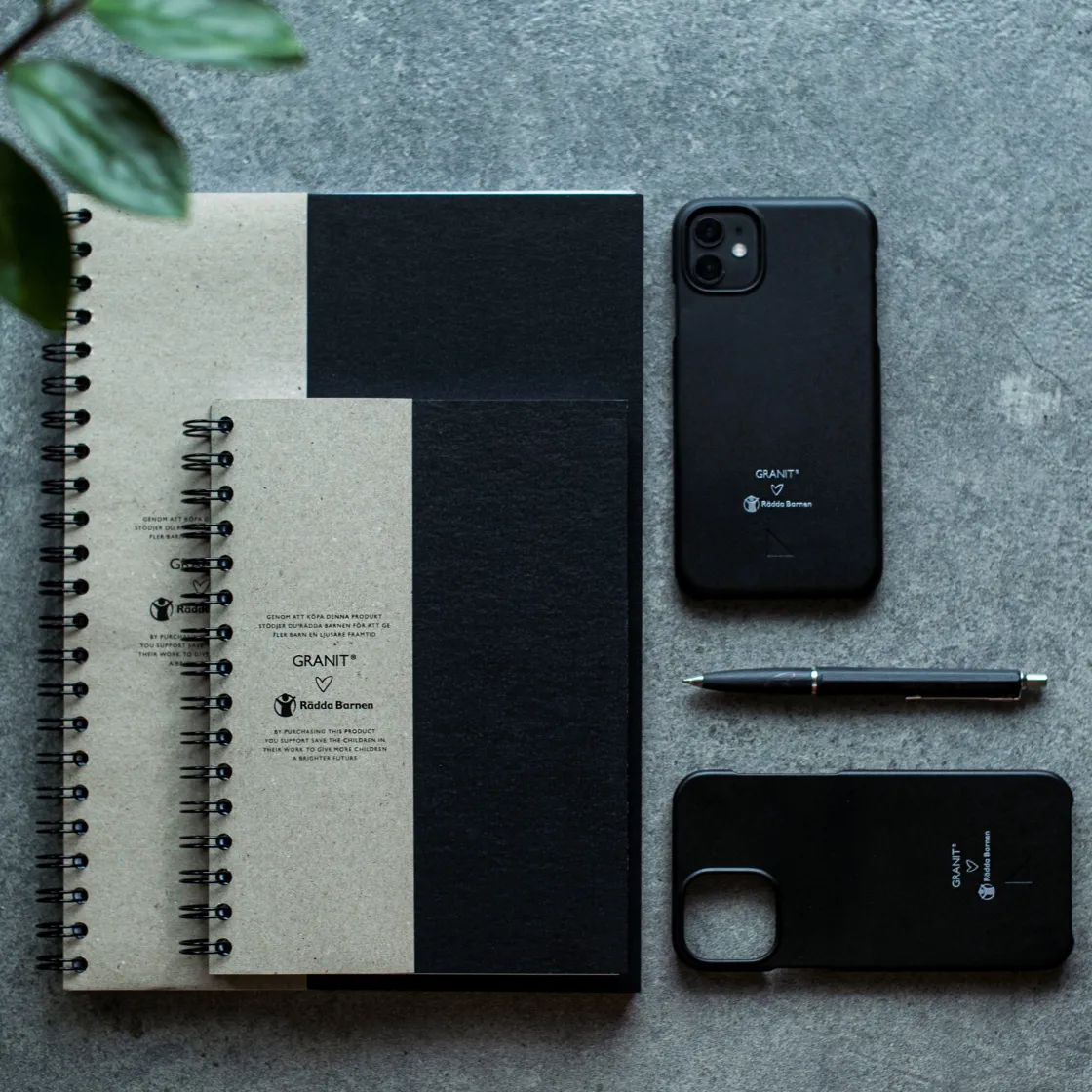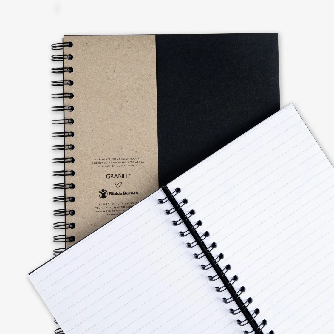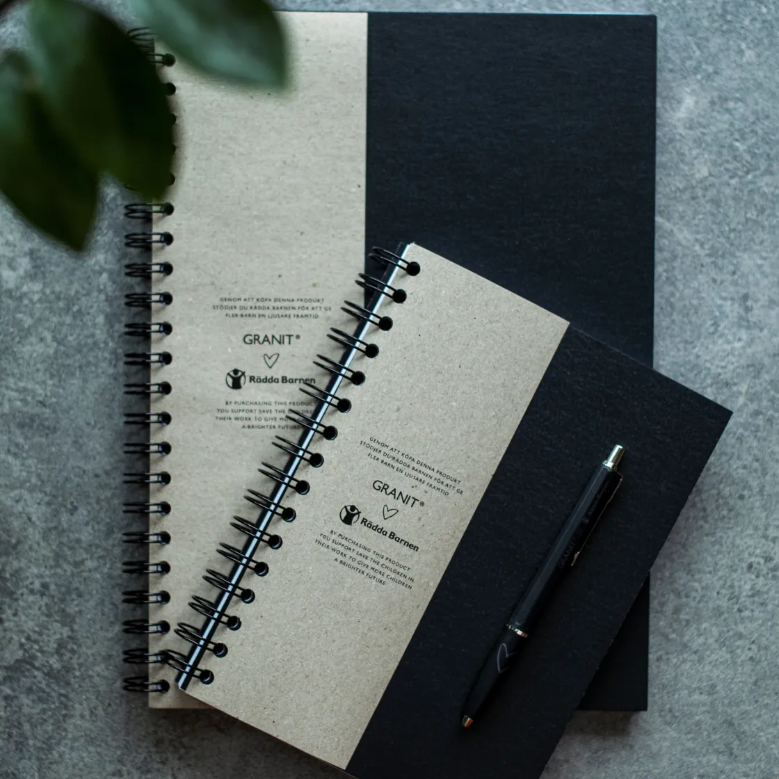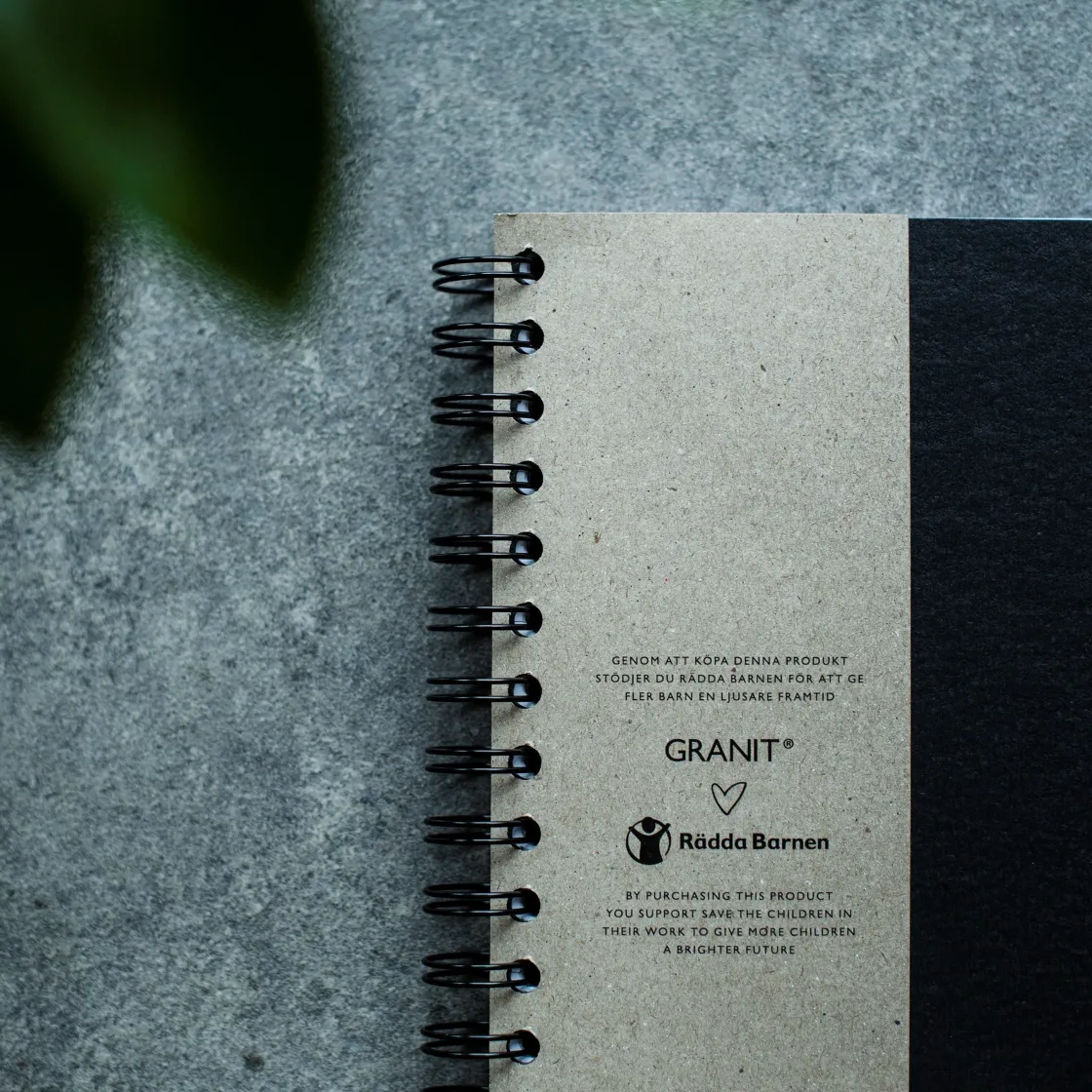 KRAV-märkt anteckningsblock i klassiskt A4-format med linjerade sidor. Blocket är spiralbundet och har ett grafitgrått omslag av kraftigare, återvunnen wellpapp och innehåller 90 sidor. Tillverkat i enlighet med Fairtrade. Blocket är även Svanenmärkt och pappret är FSC-certifierat.