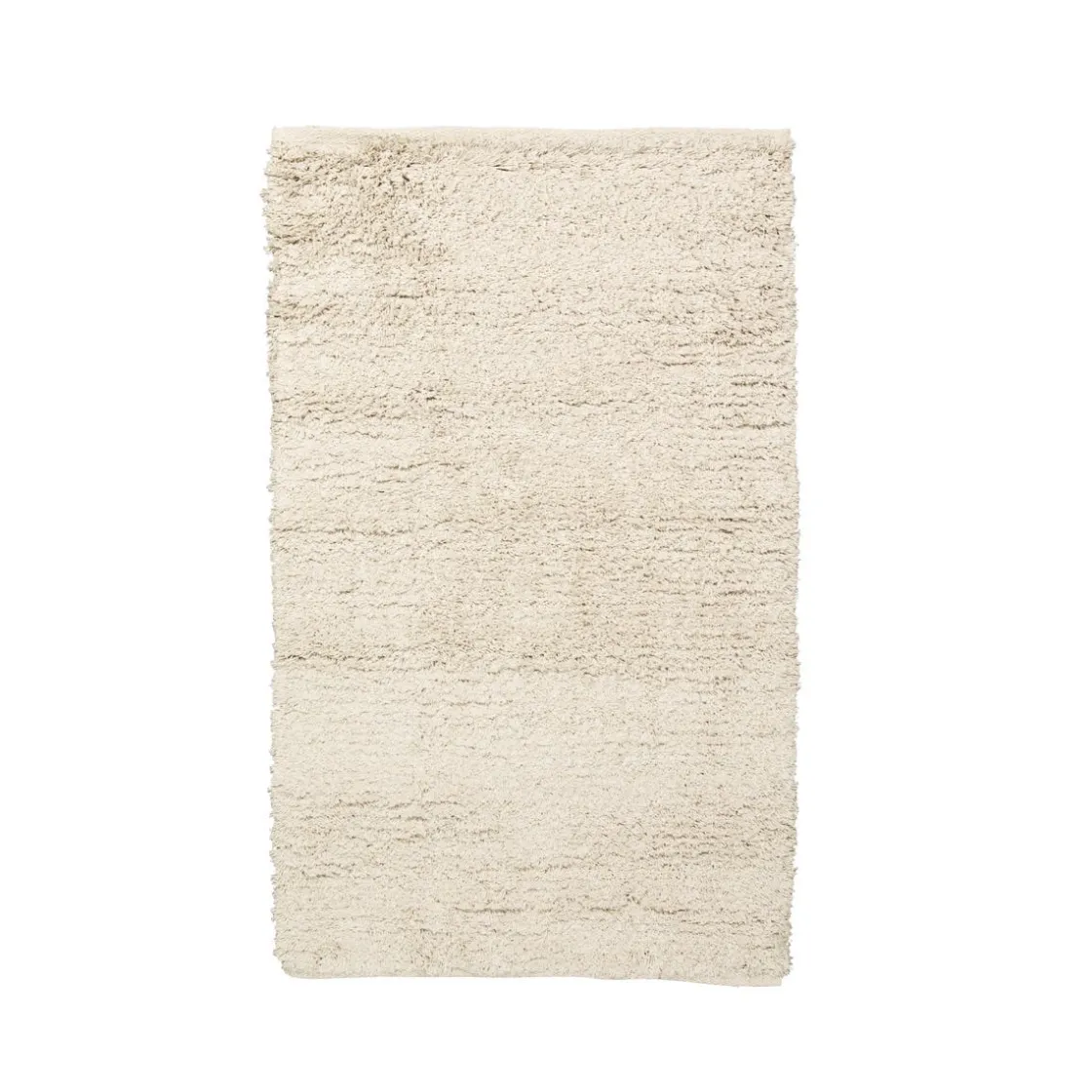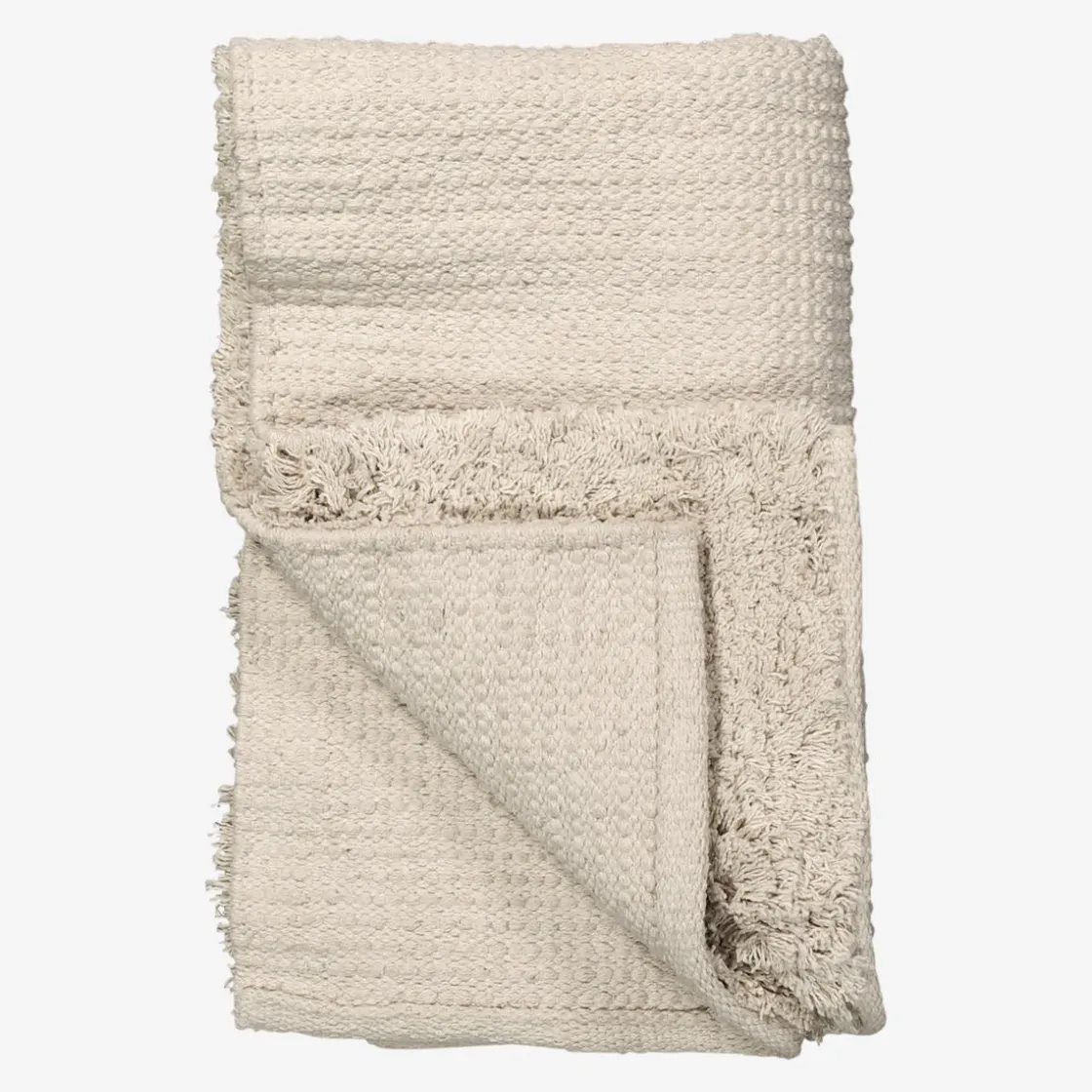En mjuk och skön badrumsmatta tillverkad av 99% återvunnen bomull och 1% andra material. Varje matta har en naturligt vit färg, där varje exemplar är unikt tack vare användningen av återvunnen bomull. Den produceras genom att återanvända textilavfall och omvandla det till fiber som sedan spinns om. Genom denna mekaniska process, som inte involverar användning av vätskor, minskas vattenförbrukningen och bomullen får nytt liv på ett hållbart sätt.