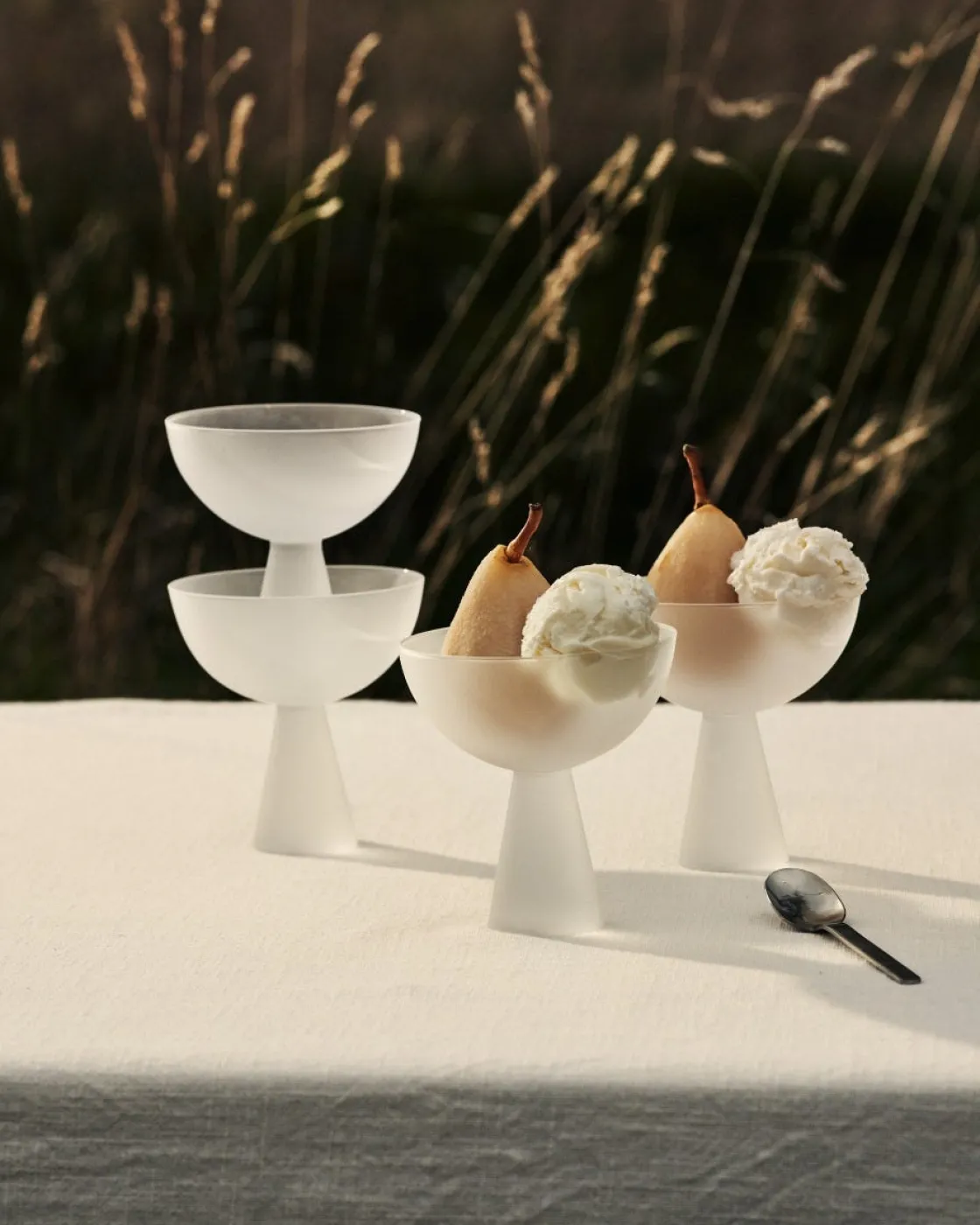 Dessertskål på fot av glas med frostad yta passar alla typer av efterrätter men även cocktails och bubbel. Tillverkat av soda-lime glas i Granits egna design – stram, avskalad formgivning som ger en modern look. Kombinera gärna skålen med glasen Ava i samma serie.