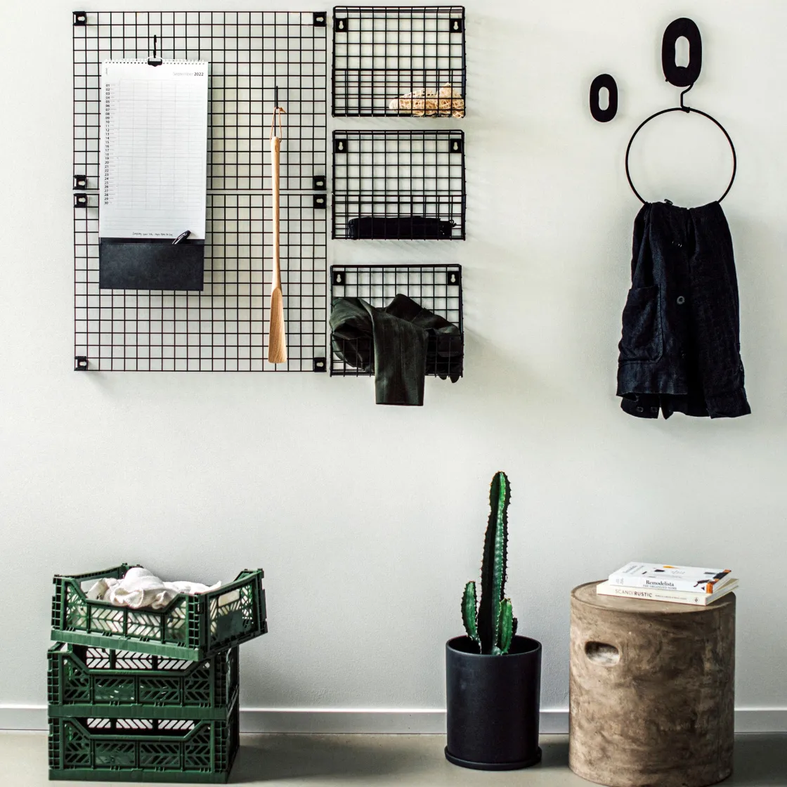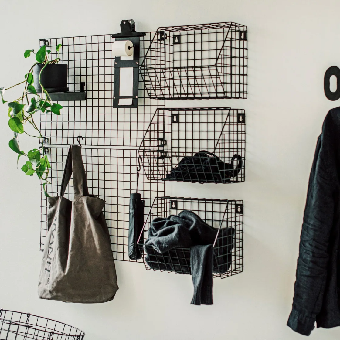 Svart förvaringstavla med rutnät i pulverlackerad metall. Sätt upp en eller flera och kombinera med vår hylla och korg för förvaringsnät samt praktiska magneter och krokar.