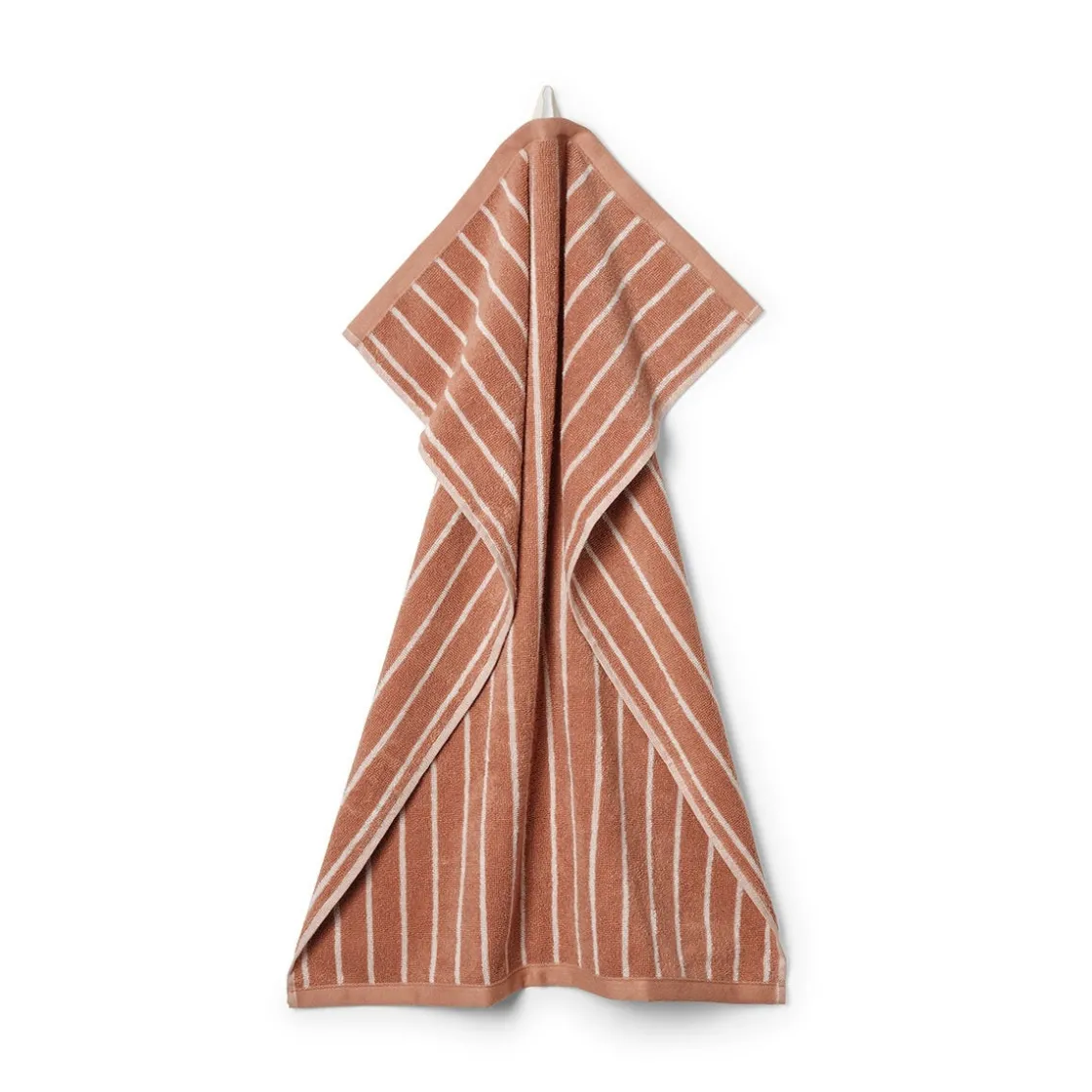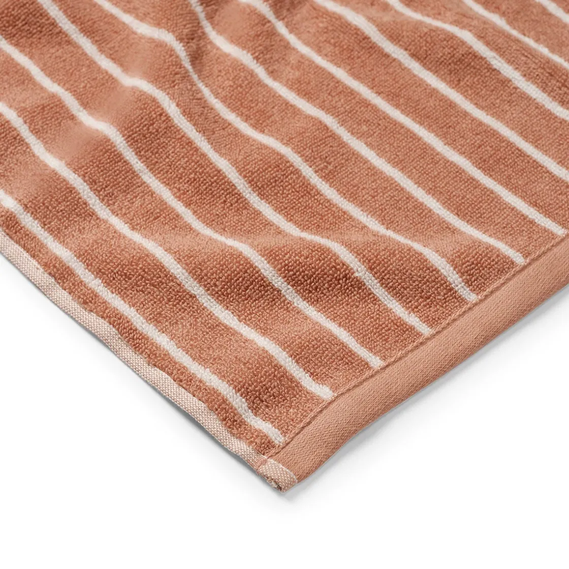Randig handduk i mjuk bomullsfrotté som är skön mot huden och har god absorptionsförmåga. En liten handduk i en varm, jordnära färg som påminner om terrakotta och på ett enkelt sätt tillför ett stilrent uttryck till ditt badrum. Perfekt som gästhandduk!
