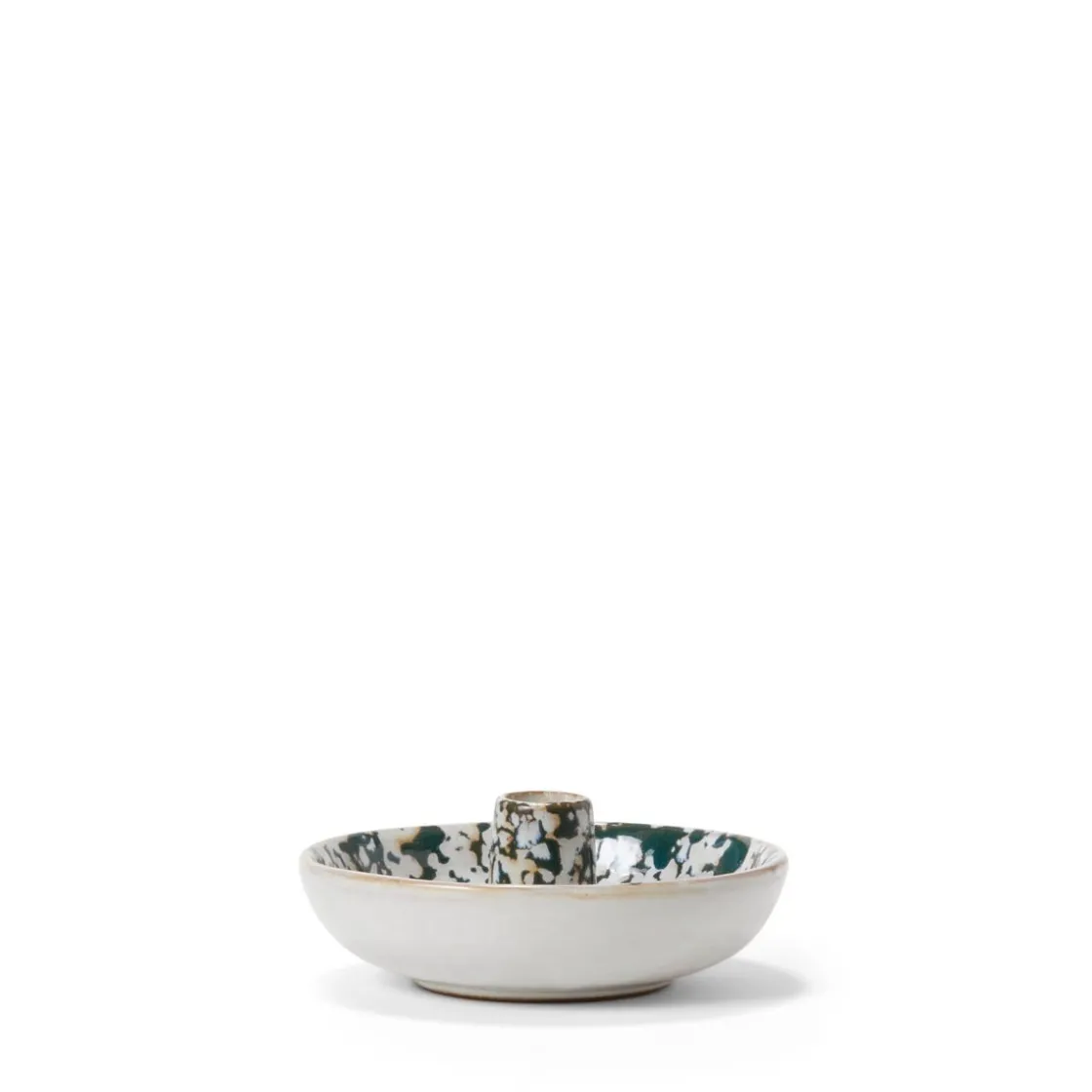 Ljusstake för kronljus i tunt stengods med reaktiv grönvit, spräcklig glasyr. Varje exemplar får ett unikt uttryck tack vare den speciella glasyren som ger levande skiftningar i färg och yta. Den generösa botten fångar upp stearin och kan även användas som bas för dekoration – men undvik lättantändligt material. Tillverkad i 100% keramik.