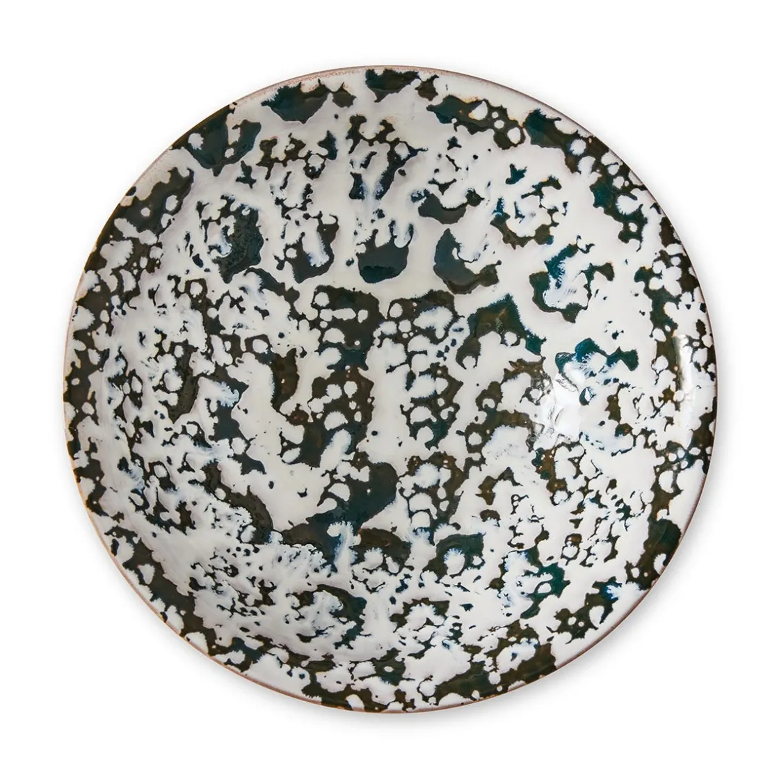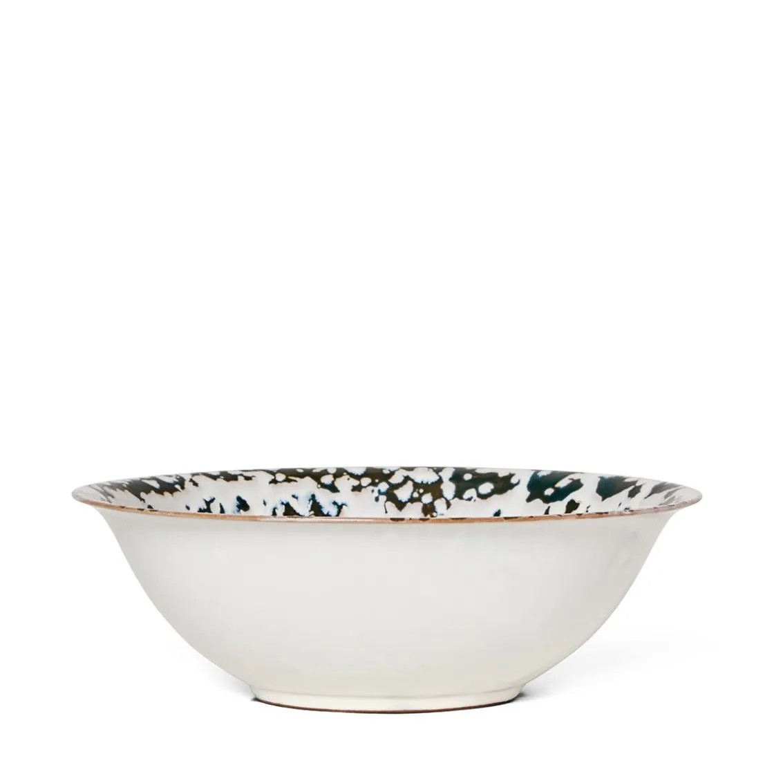 Skål i tunt stengods med reaktiv grönvit, spräcklig glasyr på insidan och vit utsida. Den speciella glasyren som ger levande skiftningar i färg och yta gör varje objekt unikt. En dekorativ skål som är perfekt till alla typer av serveringar och fin ihop med den tillhörande skålen i en större storlek. Tål diskmaskin och mikrovågsugn.