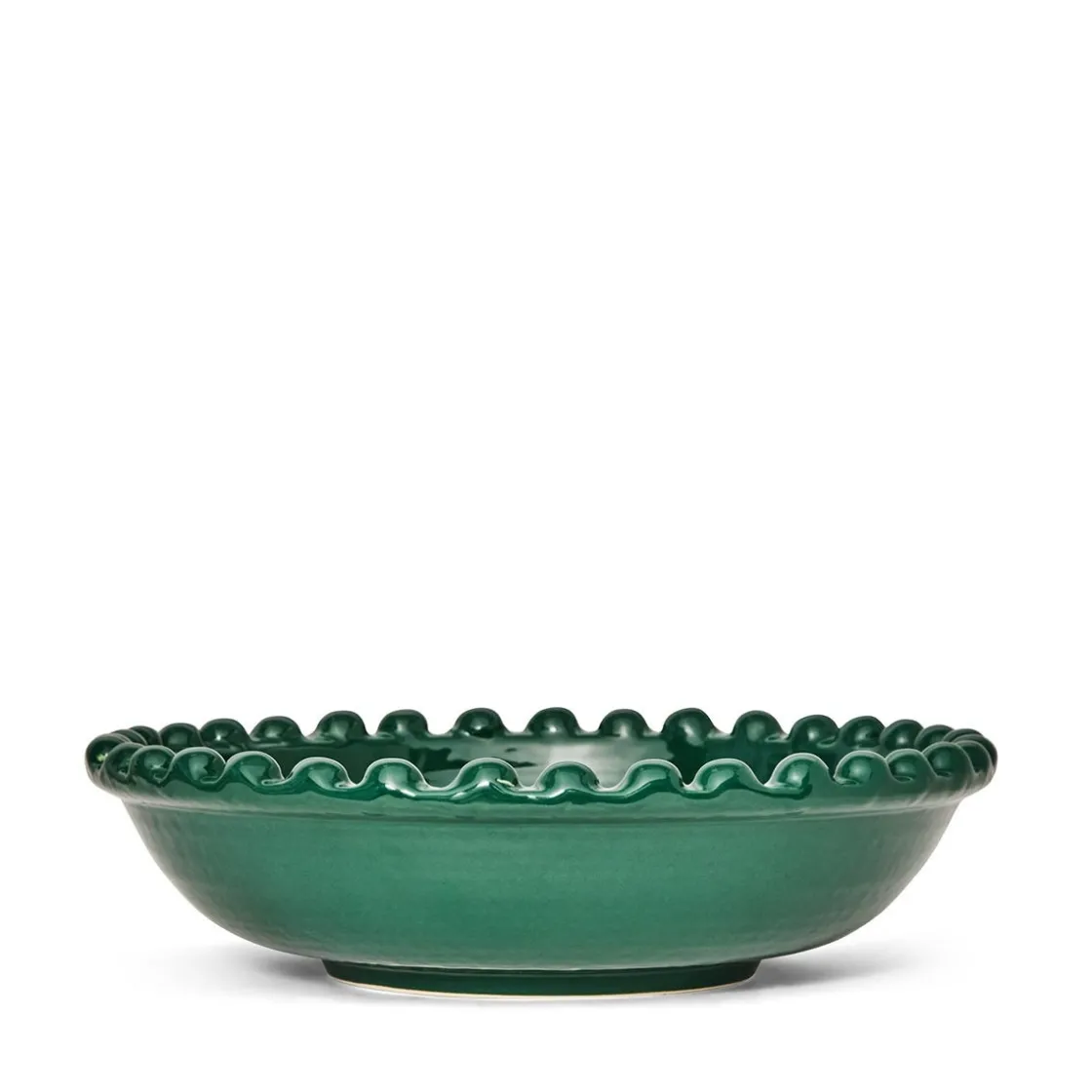 Större skål i tåligt stengods med en lekfull, dekorativ kant och en levande glasyr i en härlig grön nyans. Skålen passar lika bra som exempelvis fruktskål eller som dekorativ mittpunkt på bordet.