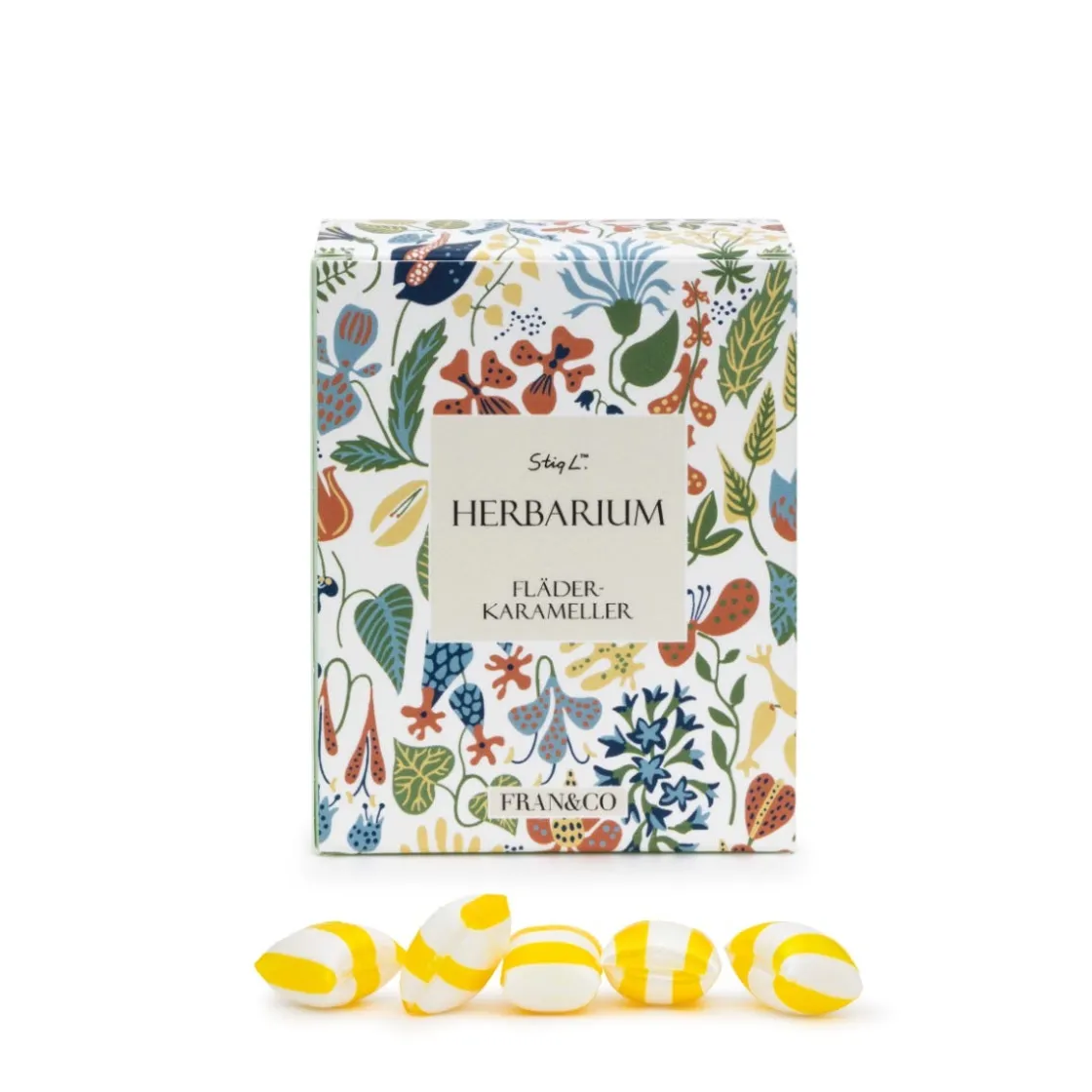 En smak av sommar i en förpackning som hyllar svensk design och tradition! Dessa goda fläderkarameller bjuder på frisk och blommig sötma, i en dekorativt mönstrad ask med print av den ikoniska formgivaren Stig Lindberg. En perfekt gå-bort-present som kombinerar god smak med tidlös estetik.