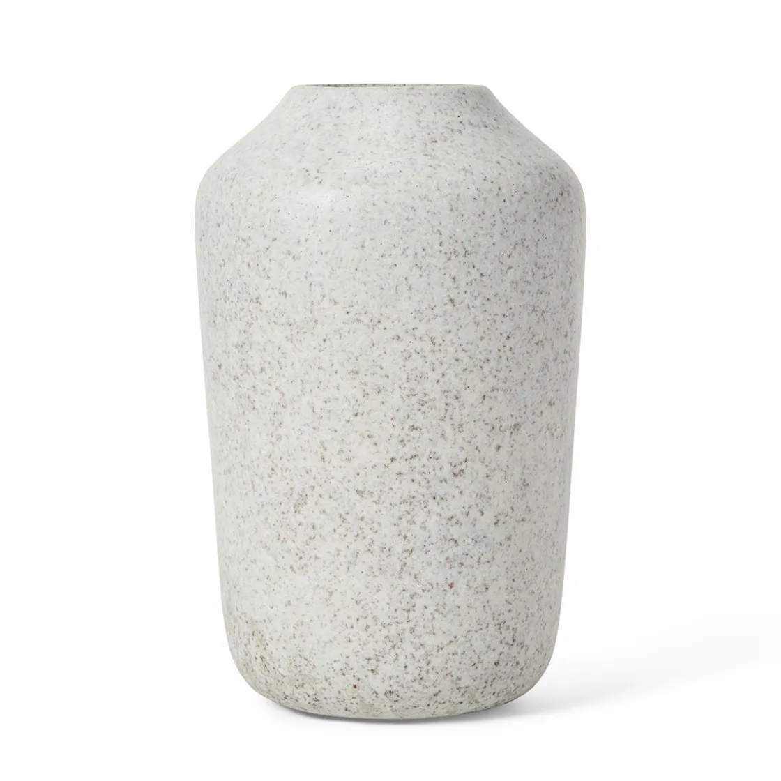 Denna tidlösa vas i matt, ljusgråspräckligt stengods har en handgjord känsla och betongliknande karaktär. Vasens tidlösa formgivningen passar lika bra med en färgstark blombukett som ensam som ett dekorativt inslag i rummet. Ytan är rå men mjuk och lätt att matcha med olika typer av inredningsstilar. Matcha gärna med ytterkrukan och ljuslyktan i samma serie för ett enhetligt uttryck.
